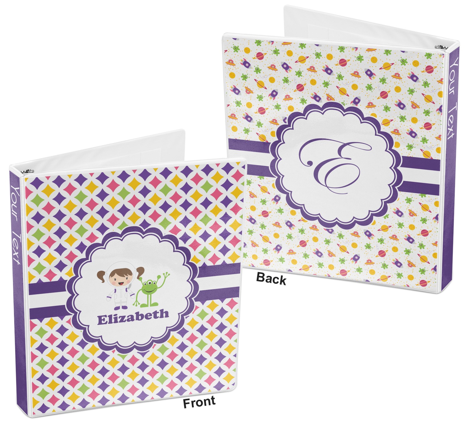 This pattern is very versatile and will mix and match with a variety of coordinated colors. A wide white band trimmed in purple tie it all together showing off little favorite personalized space girl and her favorite martian.