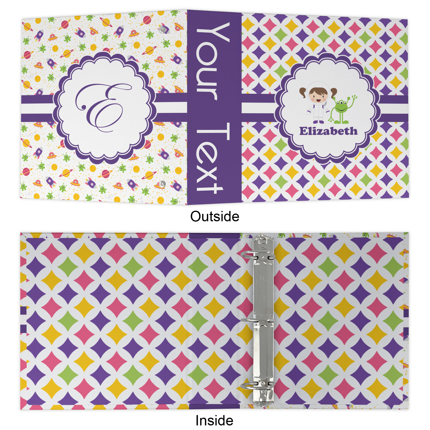 This pattern is very versatile and will mix and match with a variety of coordinated colors. A wide white band trimmed in purple tie it all together showing off little favorite personalized space girl and her favorite martian.