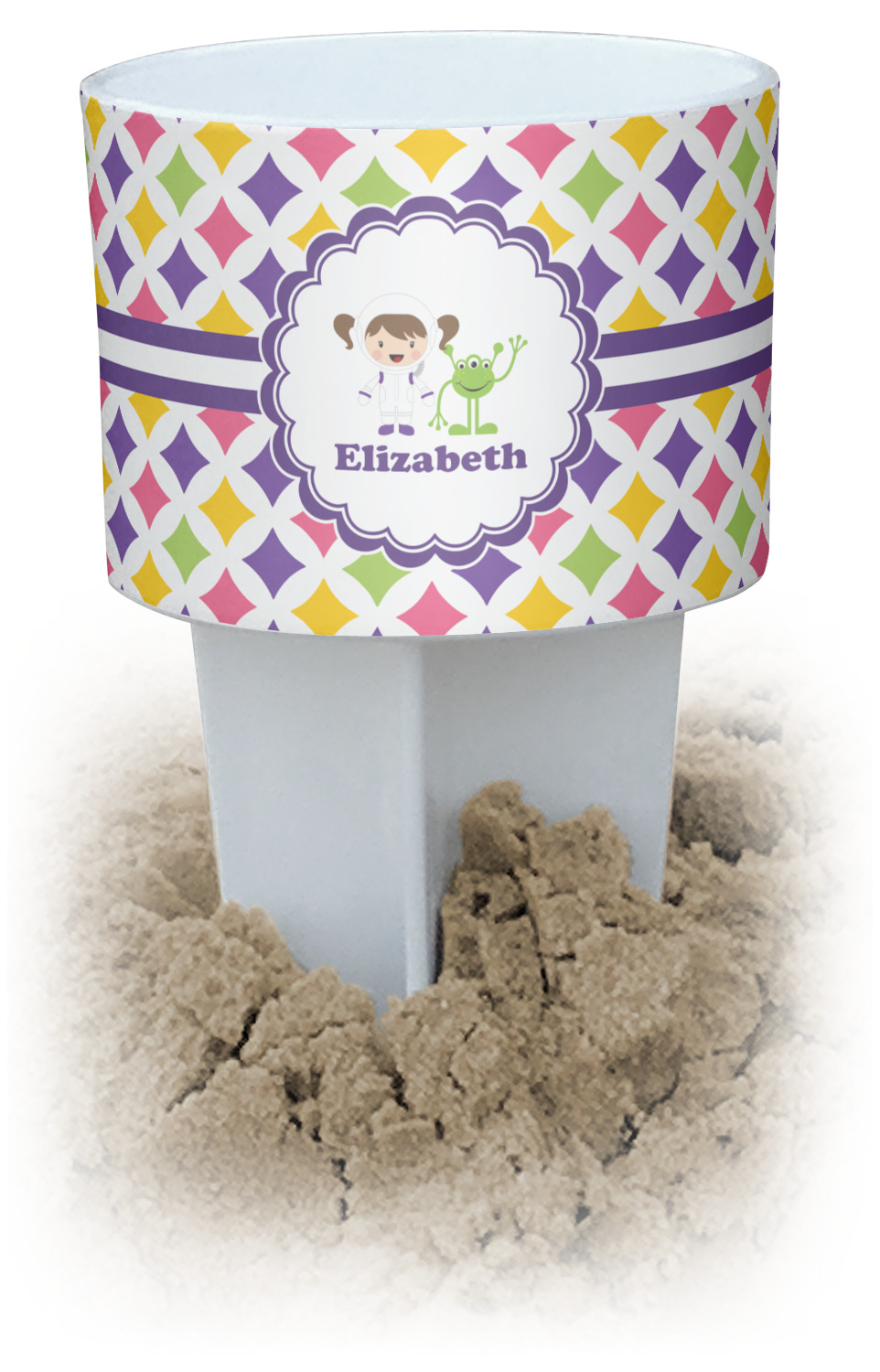 This cup holder has a large stake at its bottom that anchors it to the sand or ground below, while the cup holder rests above the stake. The entire drink holder is made of durable plastic and displays your customization around the cup holder portion. We sell these personalized beach spikers in two different colors: black and white.