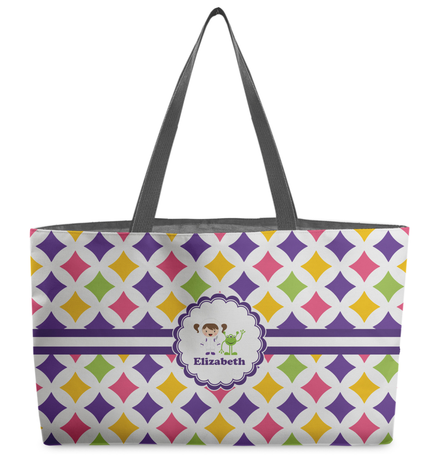 These beach totes are handmade here in the USA. Fabric is printed with your design. The tote is then sewn from the fabric pieces, lining and handles added.