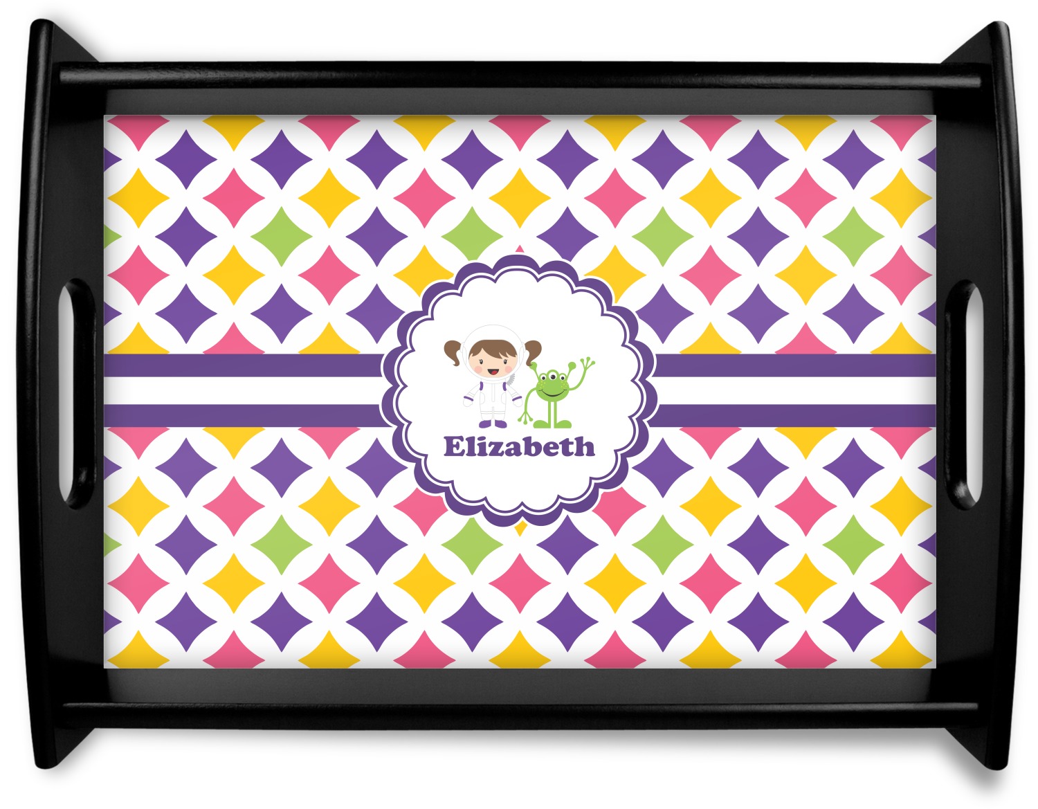 This serving tray with handles features square edges and two rounded sides, creating a very modern look. Each side is fabricated from a beautifully cut, natural wood. The bottom of the interior of the tray displays your customized design in bright, vibrant color. The tray is sold in both a black color and a natural wood look. Each variation of the wood serving tray has two sizes: Small, which is 14" x 10" x 2.25", and Large, which is 19.5" x 13.5" x 2.75".
