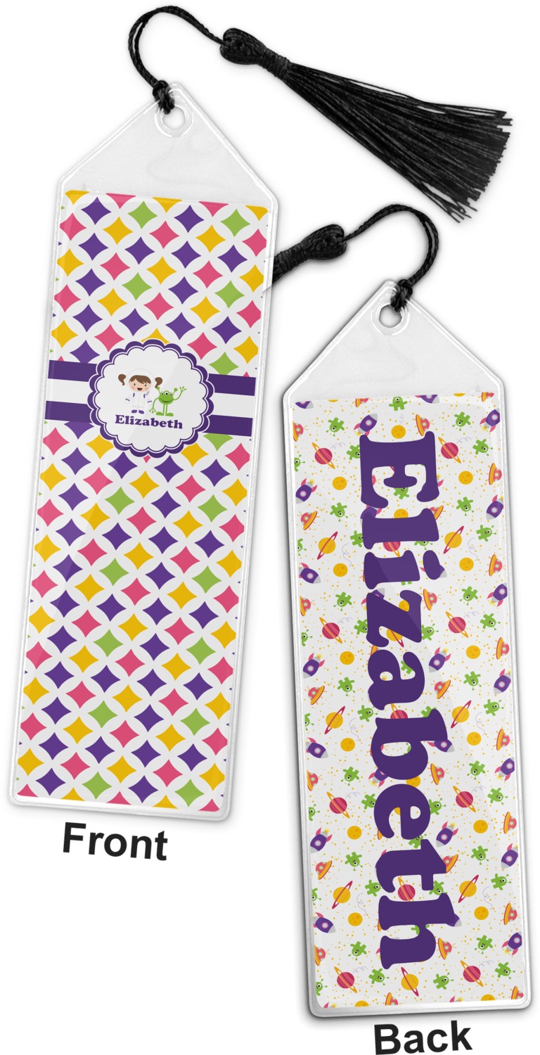 Your personalized bookmark is made of a sturdy, clear vinyl, and is approximately 7.5" x 2.25". We display your personalization on vinyl inserts that are placed on both sides. Accompanying each book marker is a black, fringe tassel that attaches to the reinforced, triangular header.