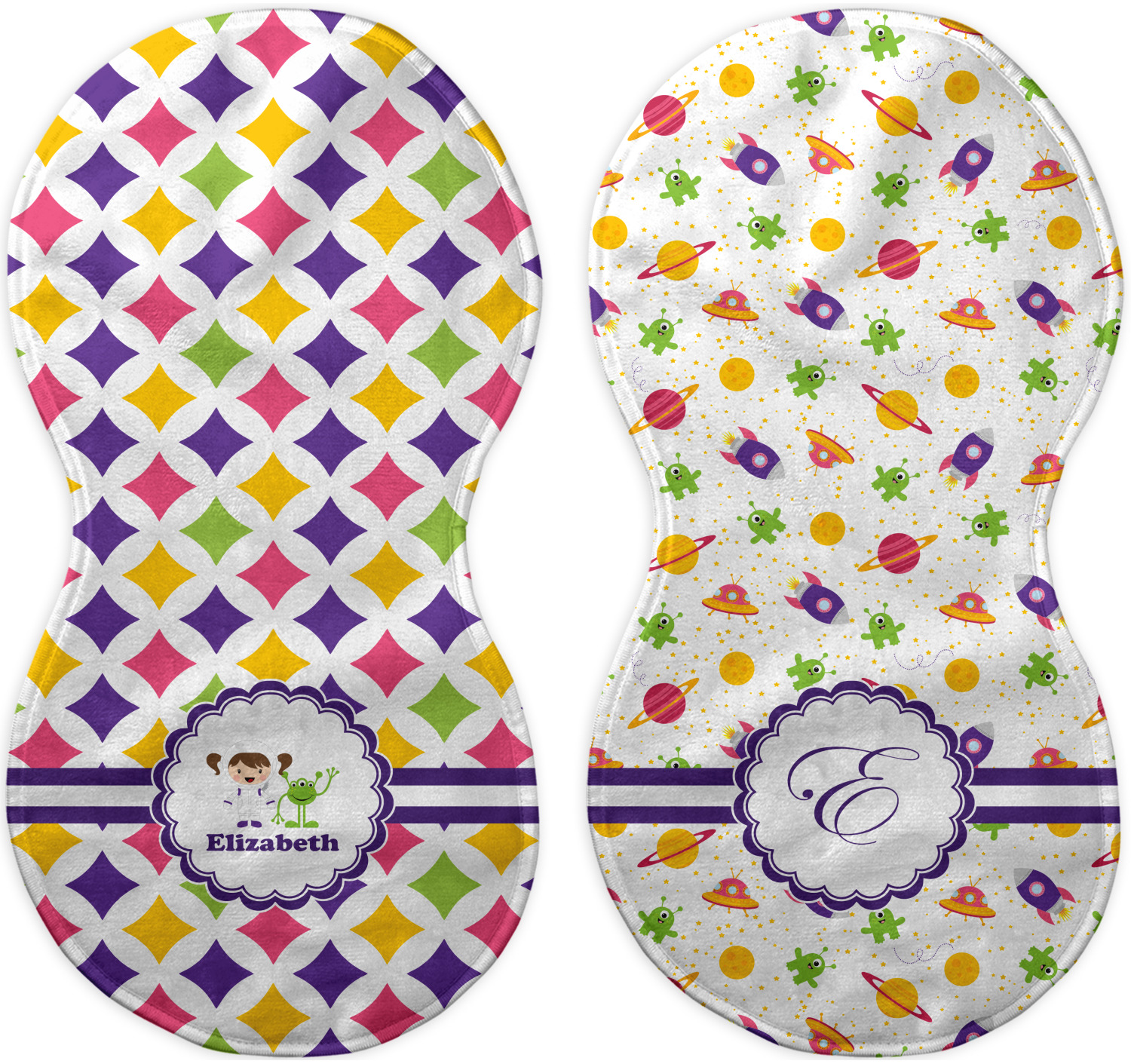 Choose your baby burp cloth from our two styles - Fleece (rectangular) or Microfiber Velour (peanut shape). The lightweight and absorbent design makes each burp cloth multipurpose; use them as a burp pad, a lap pad, a changing table, or a spare cloth to clean up any baby mess. Your customization is displayed across the front with baby-safe ink to ensure extra comfort with a white backing.