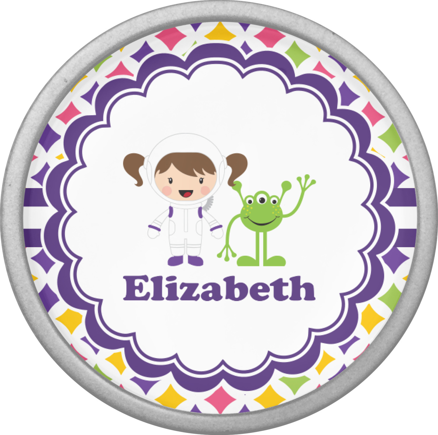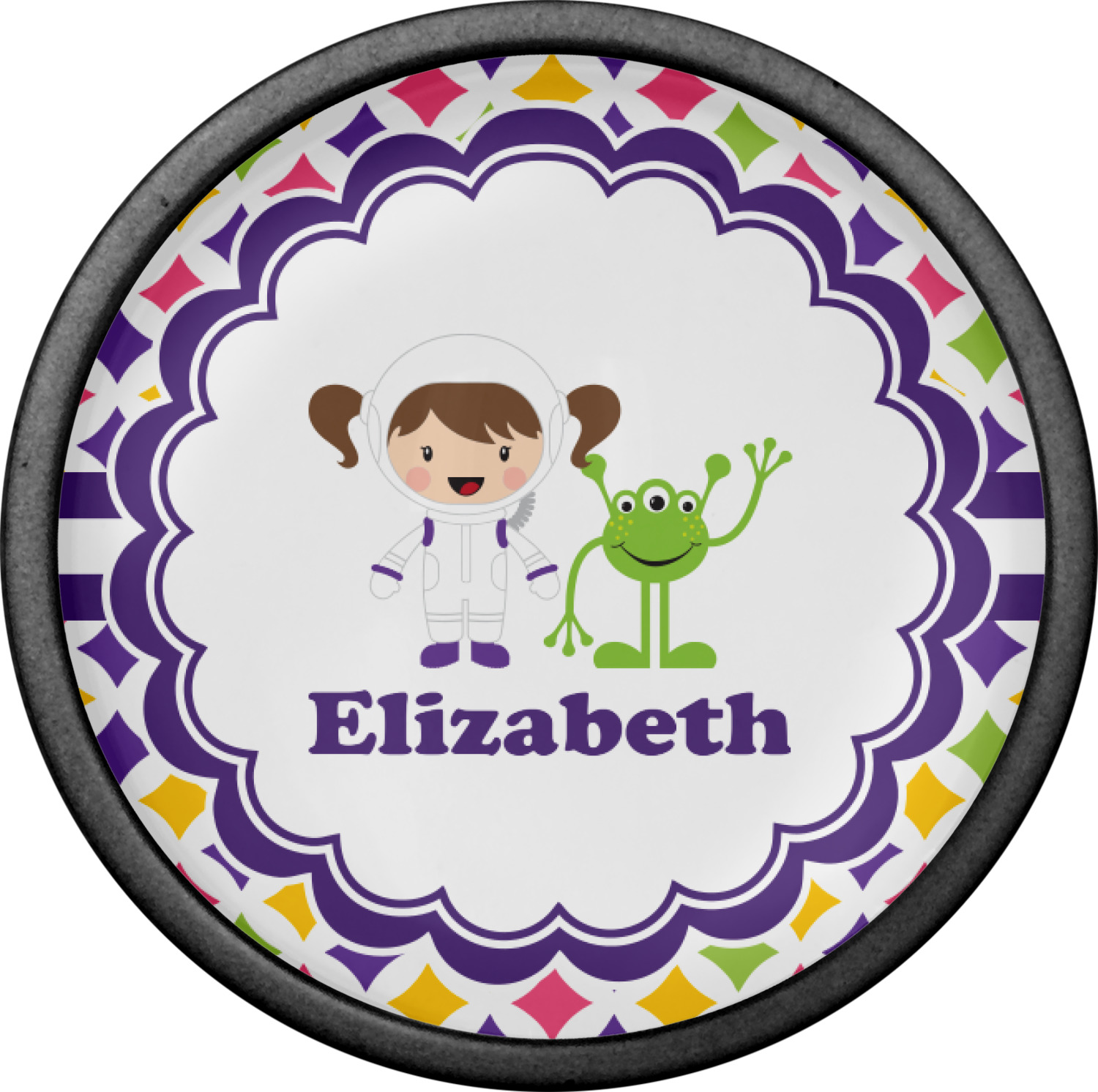 This pattern is very versatile and will mix and match with a variety of coordinated colors. A wide white band trimmed in purple tie it all together showing off little favorite personalized space girl and her favorite martian.