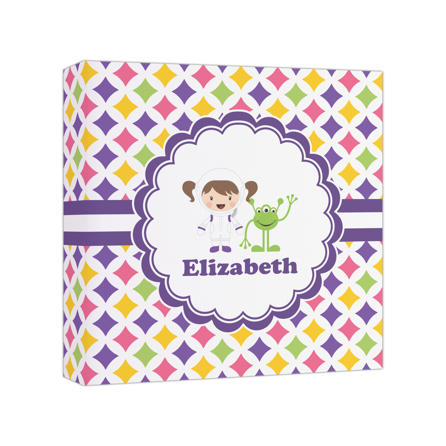 This pattern is very versatile and will mix and match with a variety of coordinated colors. A wide white band trimmed in purple tie it all together showing off little favorite personalized space girl and her favorite martian.
