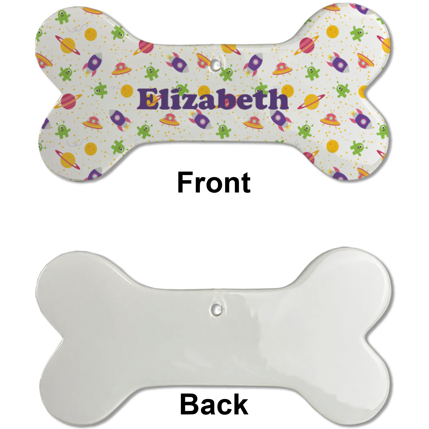 Our dog Christmas ornaments are a ceramic material with a bone-shaped structure hung horizontally. We offer two printing styles to personalize your furry friend's ornament! Choose a one-sided printing, perfect for wall decor, memorial accessory, or doghouse nameplate! Create a double-sided ornament perfect for adorning the Christmas tree. Each dog bone ornament is approximately 4.75" x 2.25" and is printed here in the USA.