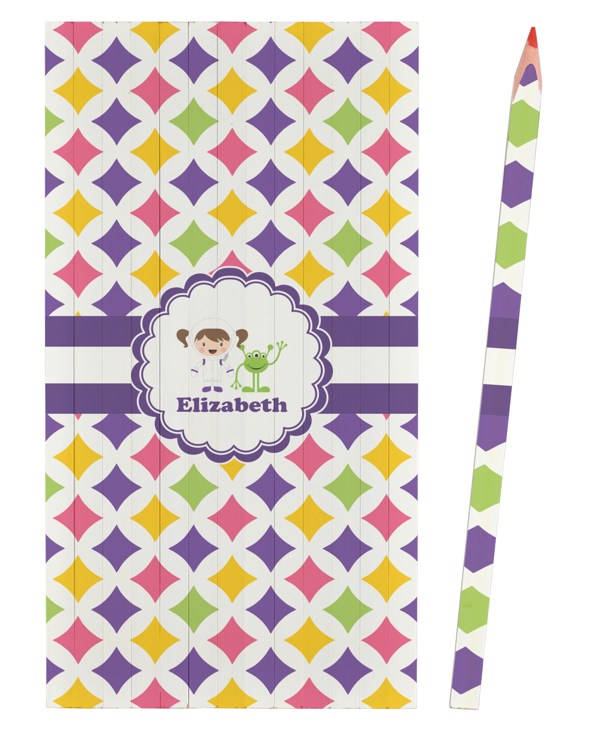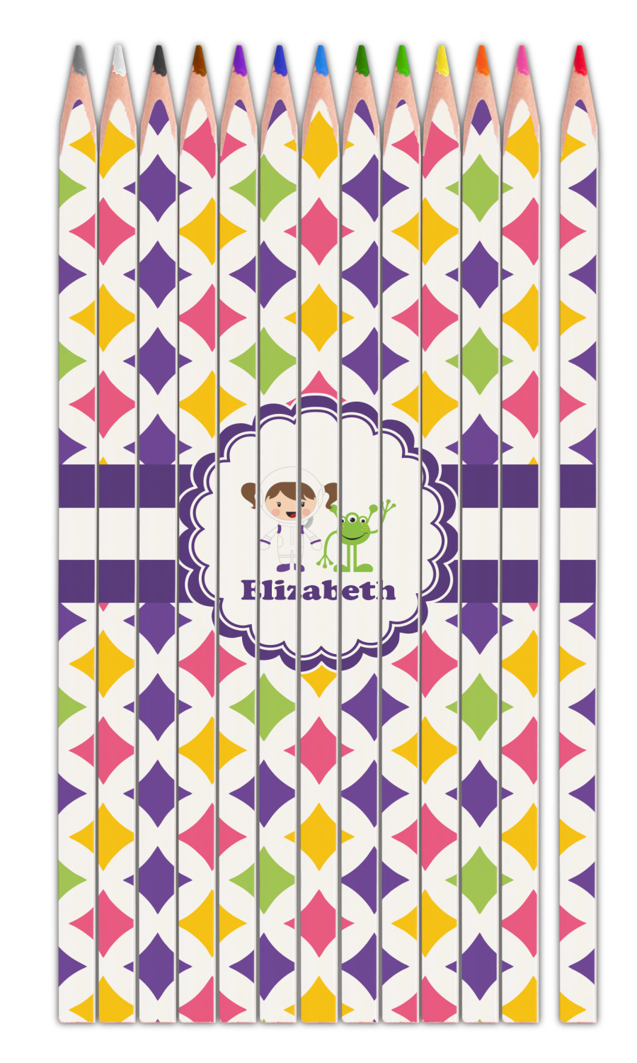 This pattern is very versatile and will mix and match with a variety of coordinated colors. A wide white band trimmed in purple tie it all together showing off little favorite personalized space girl and her favorite martian.