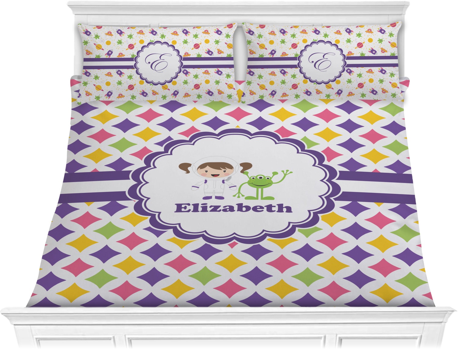 This pattern is very versatile and will mix and match with a variety of coordinated colors. A wide white band trimmed in purple tie it all together showing off little favorite personalized space girl and her favorite martian.