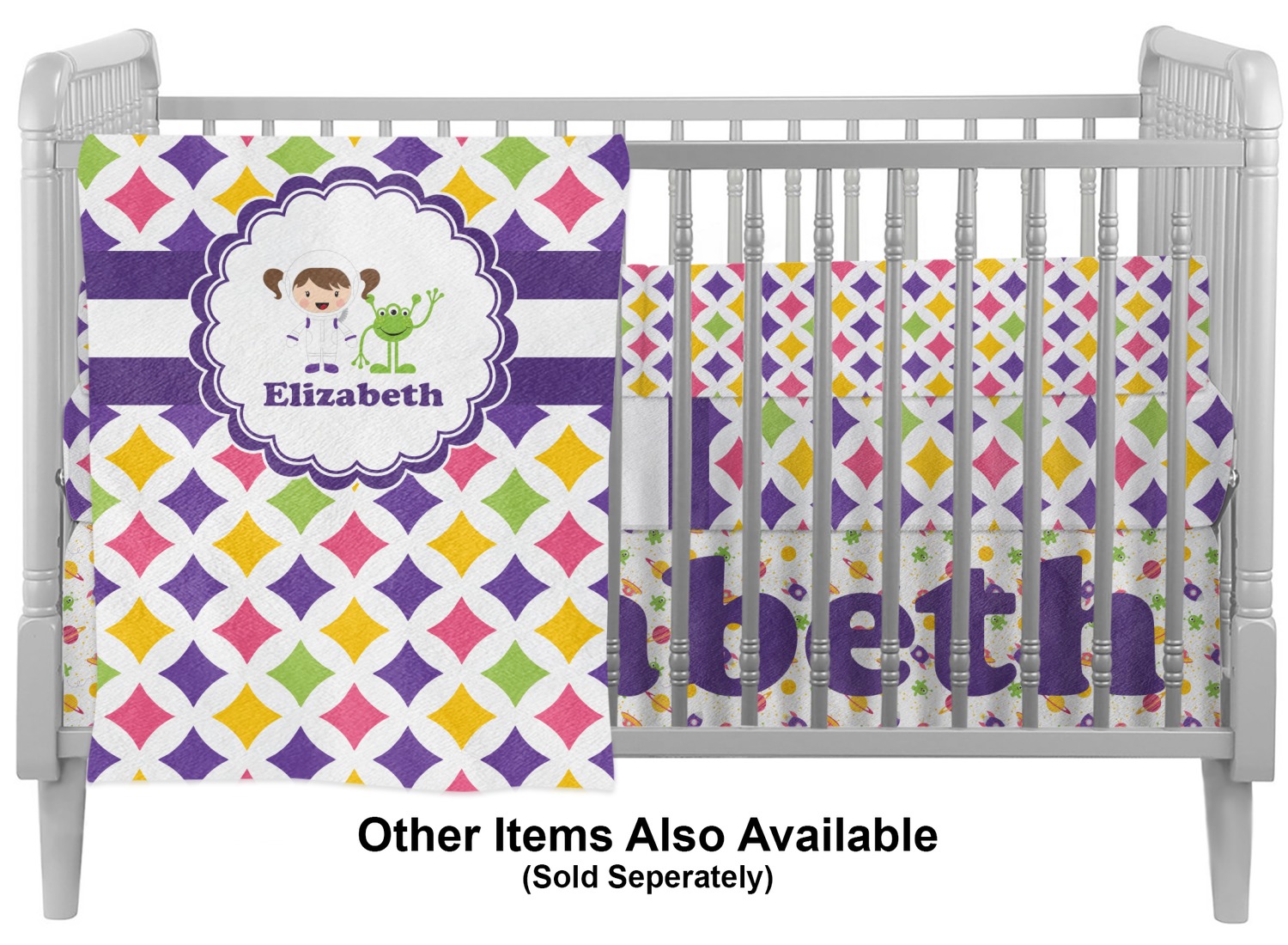 This pattern is very versatile and will mix and match with a variety of coordinated colors. A wide white band trimmed in purple tie it all together showing off little favorite personalized space girl and her favorite martian.