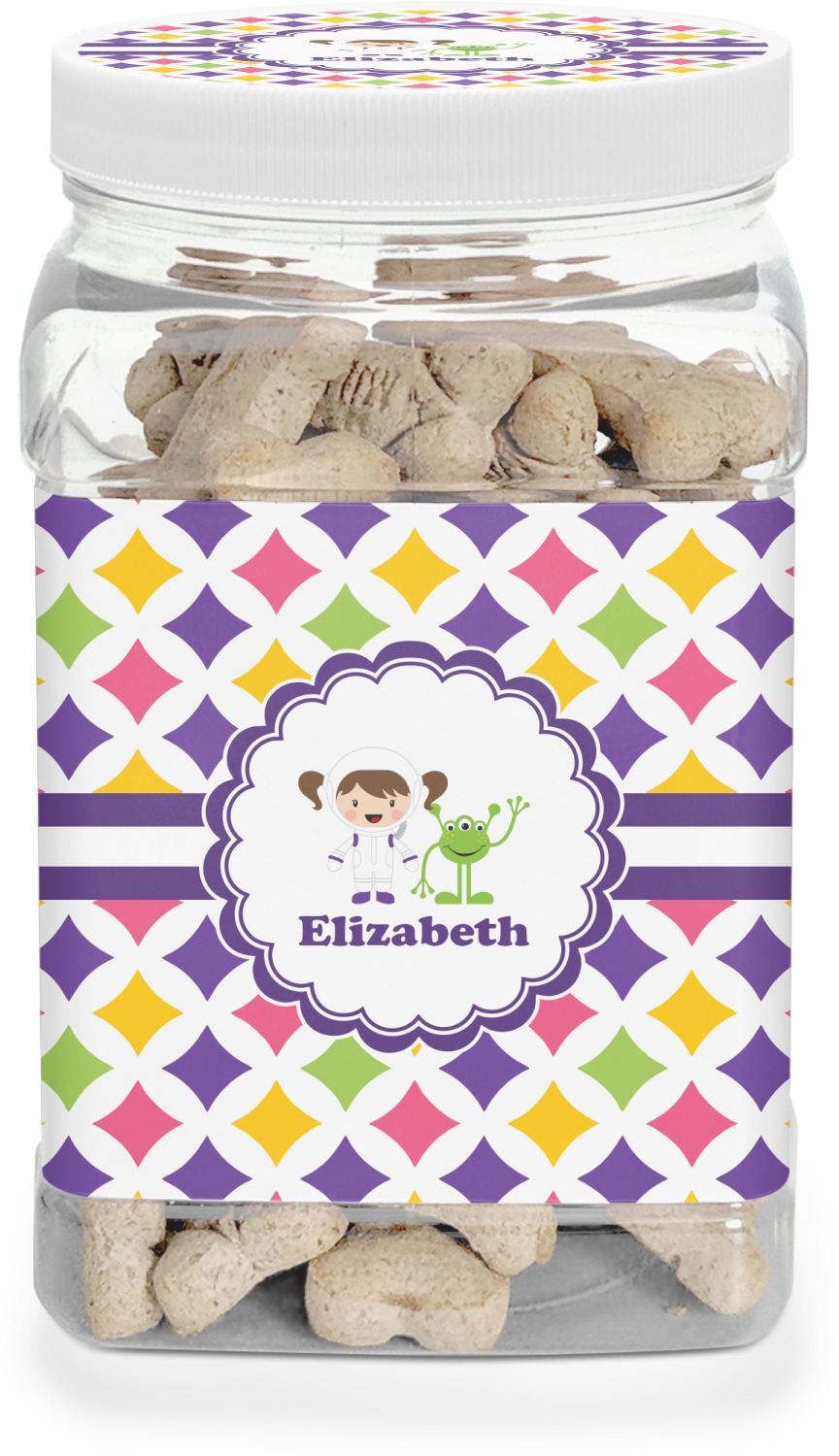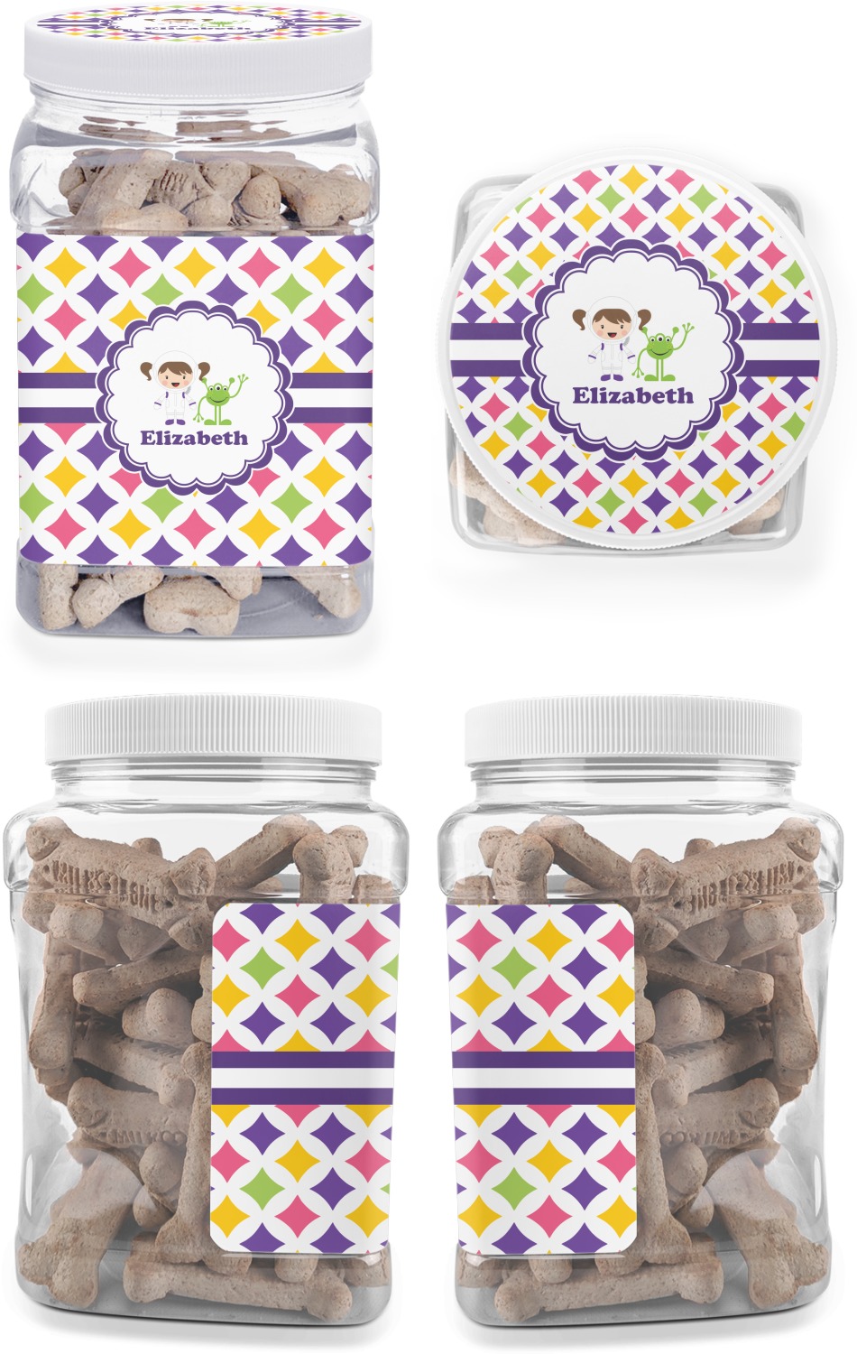 This half gallon jar, made from a sturdy plastic, is the perfect way to keep treats from any naughty pet paws, while still keeping them ready on hand for when your pup performs an impressive trick. This dog cookie jar features a screw-on, white lid that displays your personalized design on a vinyl sticker. We apply another customized sticker that wraps around the front and sides of the jar. Our dog treat jar also has indentations on the rear ends of the sides, which allows for convenient handling, and its square frame allows for easy storage.