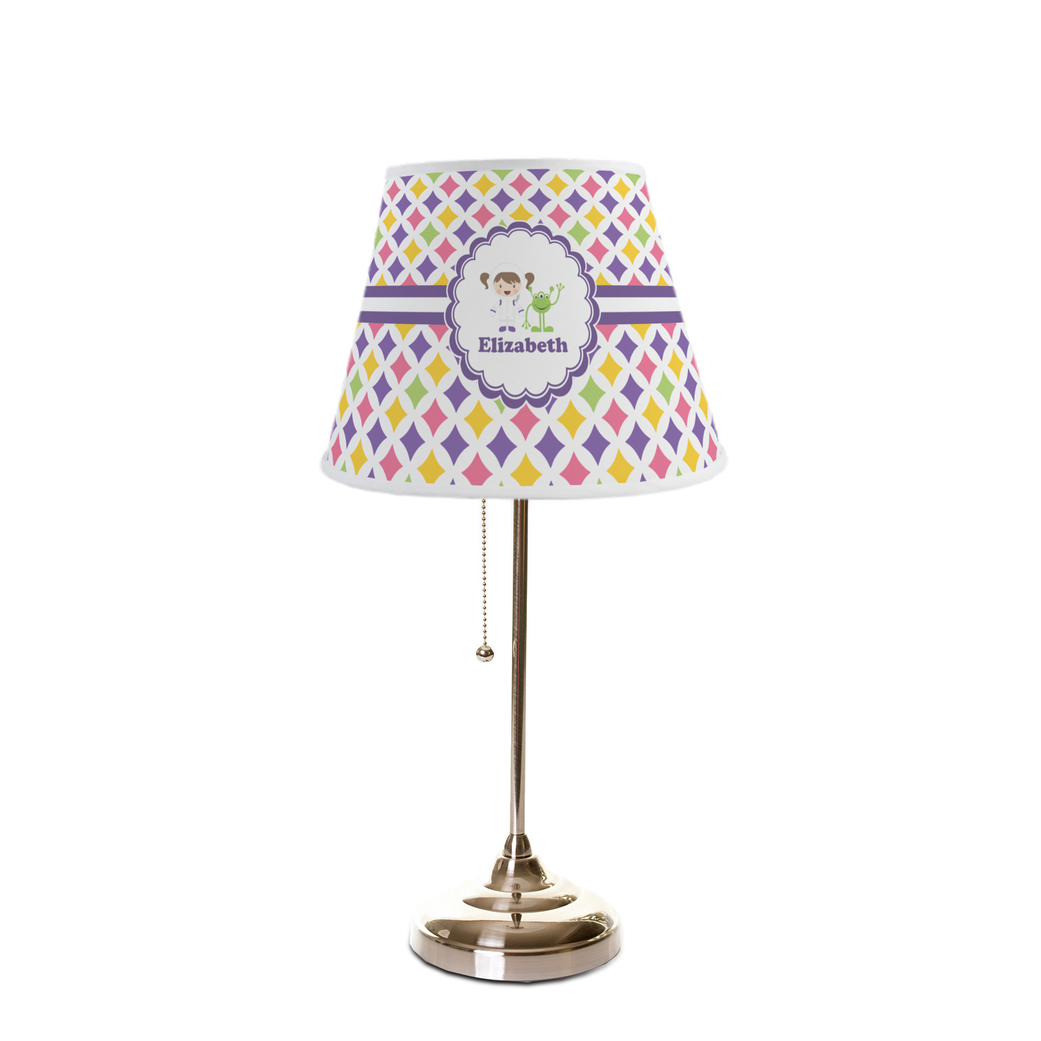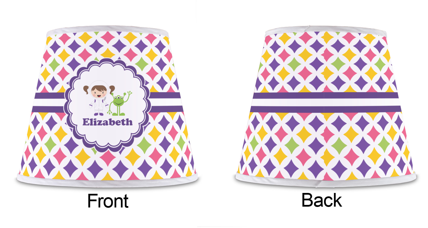The base of this lampshade is 12 inches in diameter, and the top spans 8 inches in diameter. The total height of the lampshade is 10 inches. The angled nature of this custom lampshade concentrates the light, making it ideal for smaller spaces. This lampshade is made of matte, polyfilm, and displays your customization in its middle. The top and bottom of this colorful lamp shade are lined with a white fabric ribbon (which can be replaced with black inside the design studio) which frames your design and creates a sophisticated finish. As an UNO fitter lampshade, this unique lamp shade will fit a variety of bases.