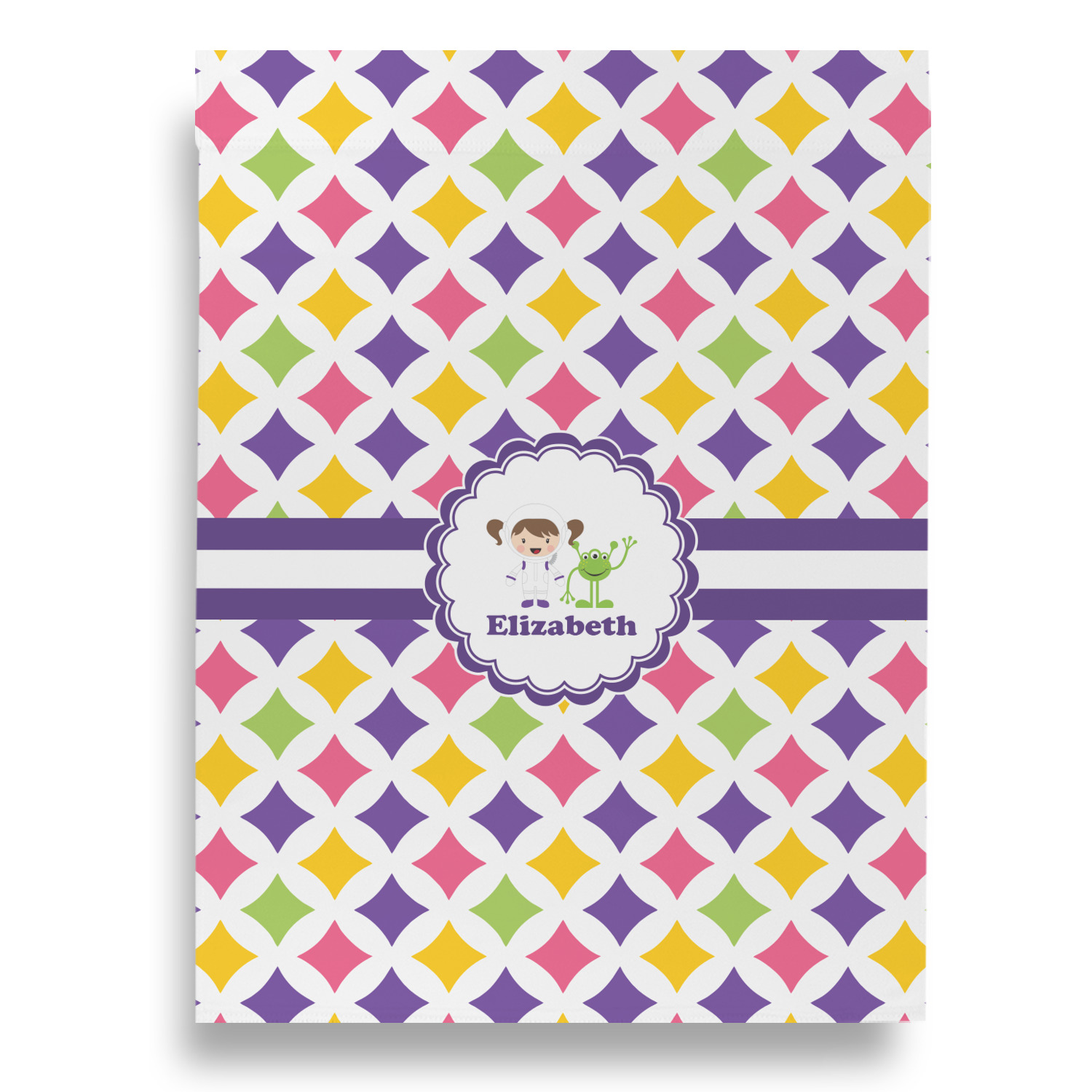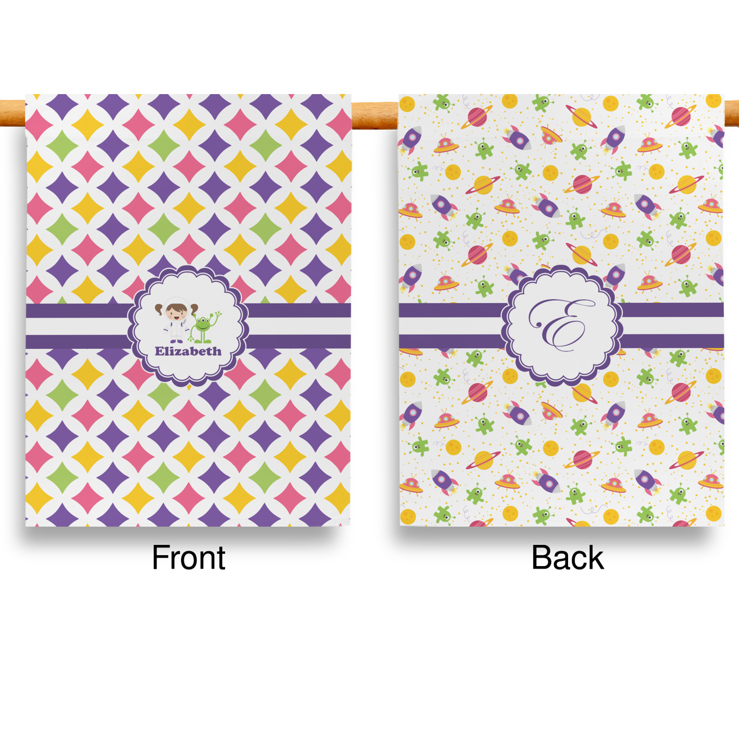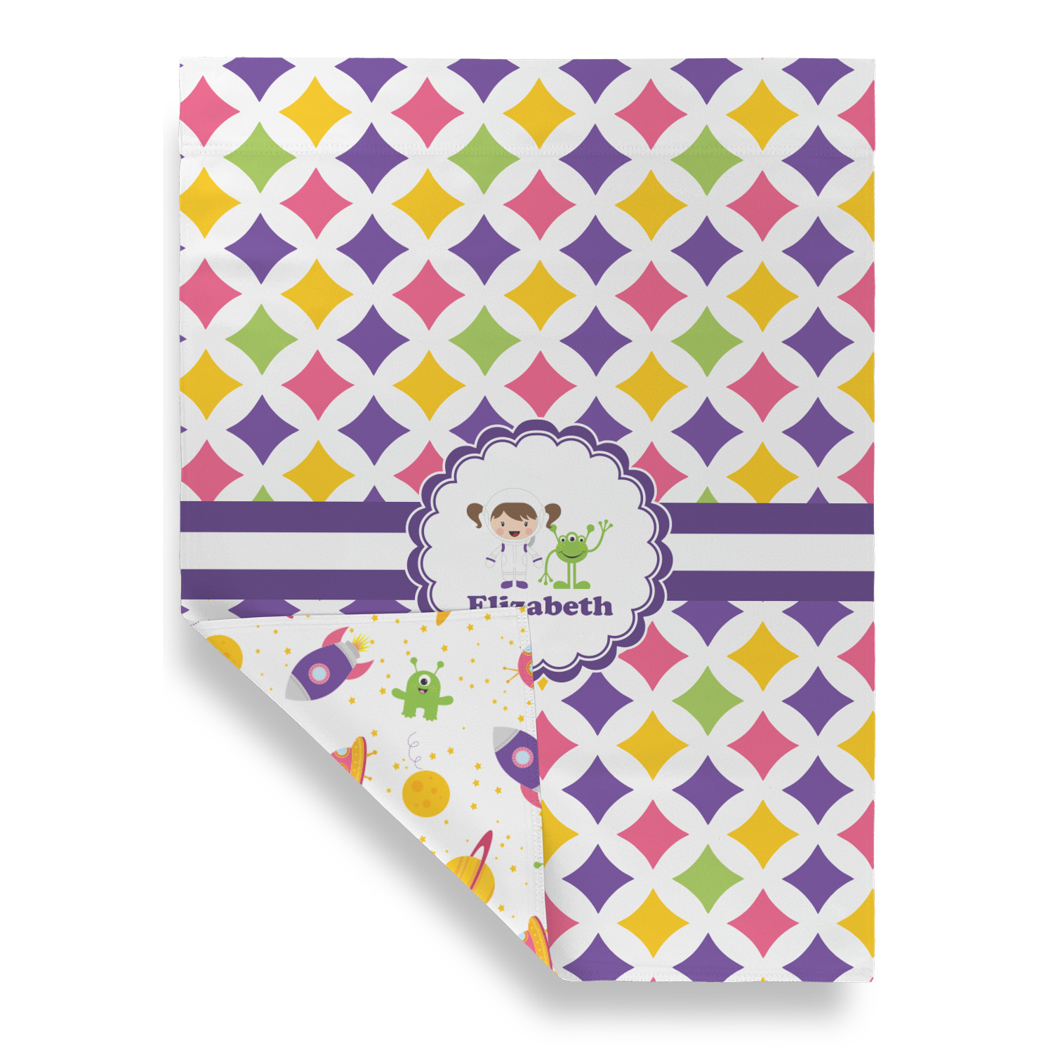 This pattern is very versatile and will mix and match with a variety of coordinated colors. A wide white band trimmed in purple tie it all together showing off little favorite personalized space girl and her favorite martian.