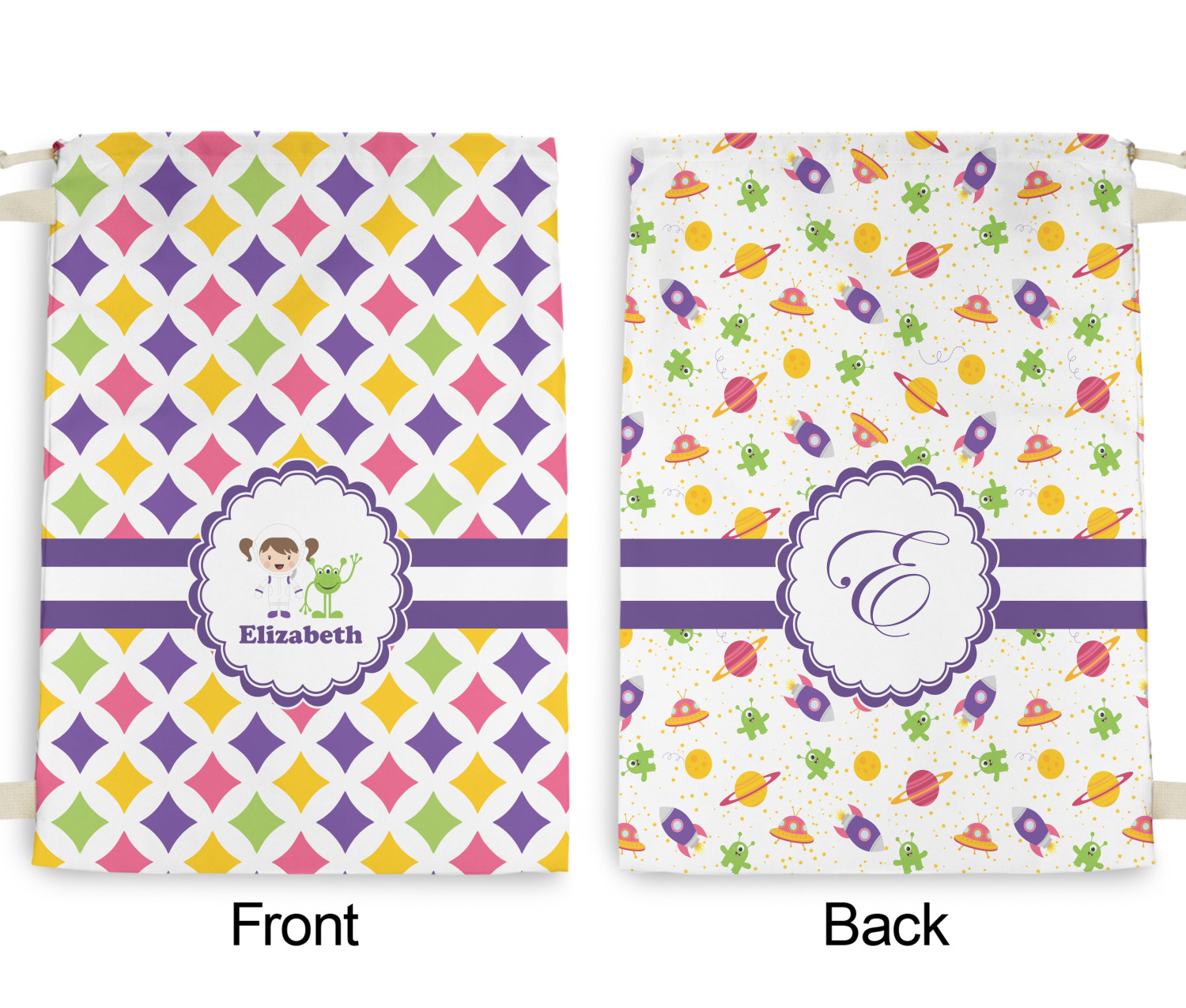 This pattern is very versatile and will mix and match with a variety of coordinated colors. A wide white band trimmed in purple tie it all together showing off little favorite personalized space girl and her favorite martian.
