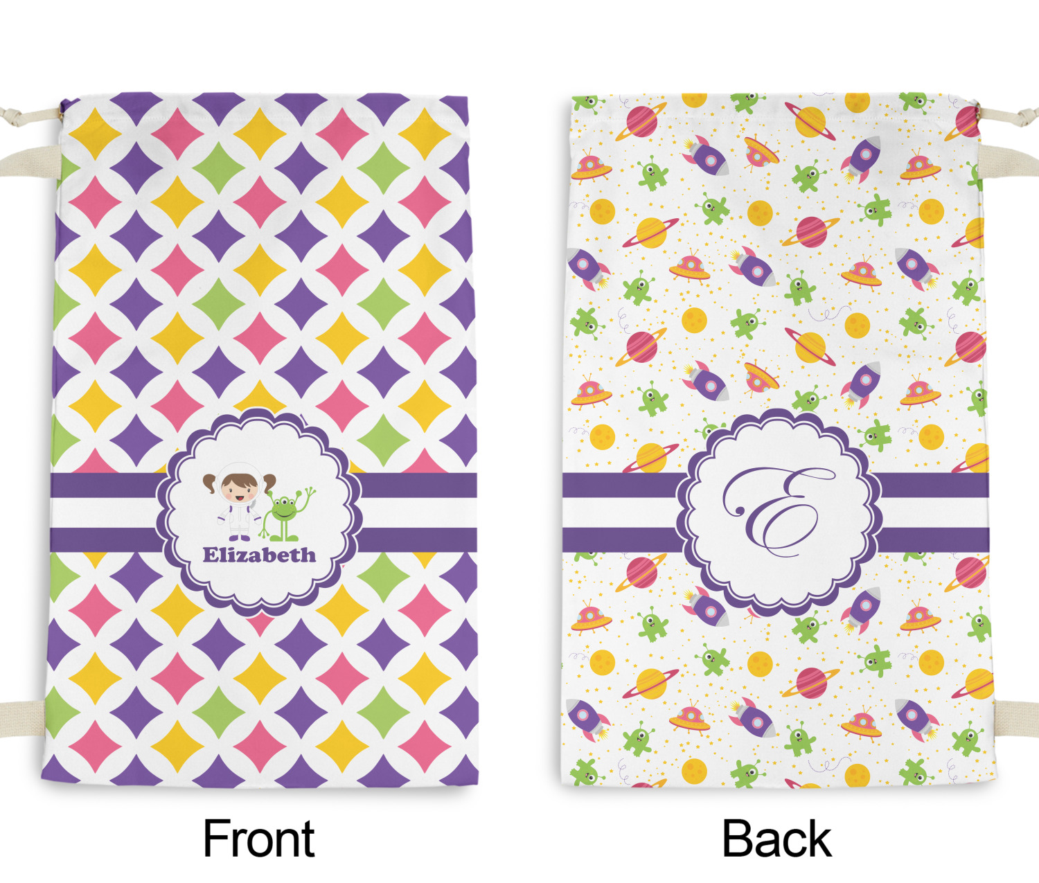 This pattern is very versatile and will mix and match with a variety of coordinated colors. A wide white band trimmed in purple tie it all together showing off little favorite personalized space girl and her favorite martian.