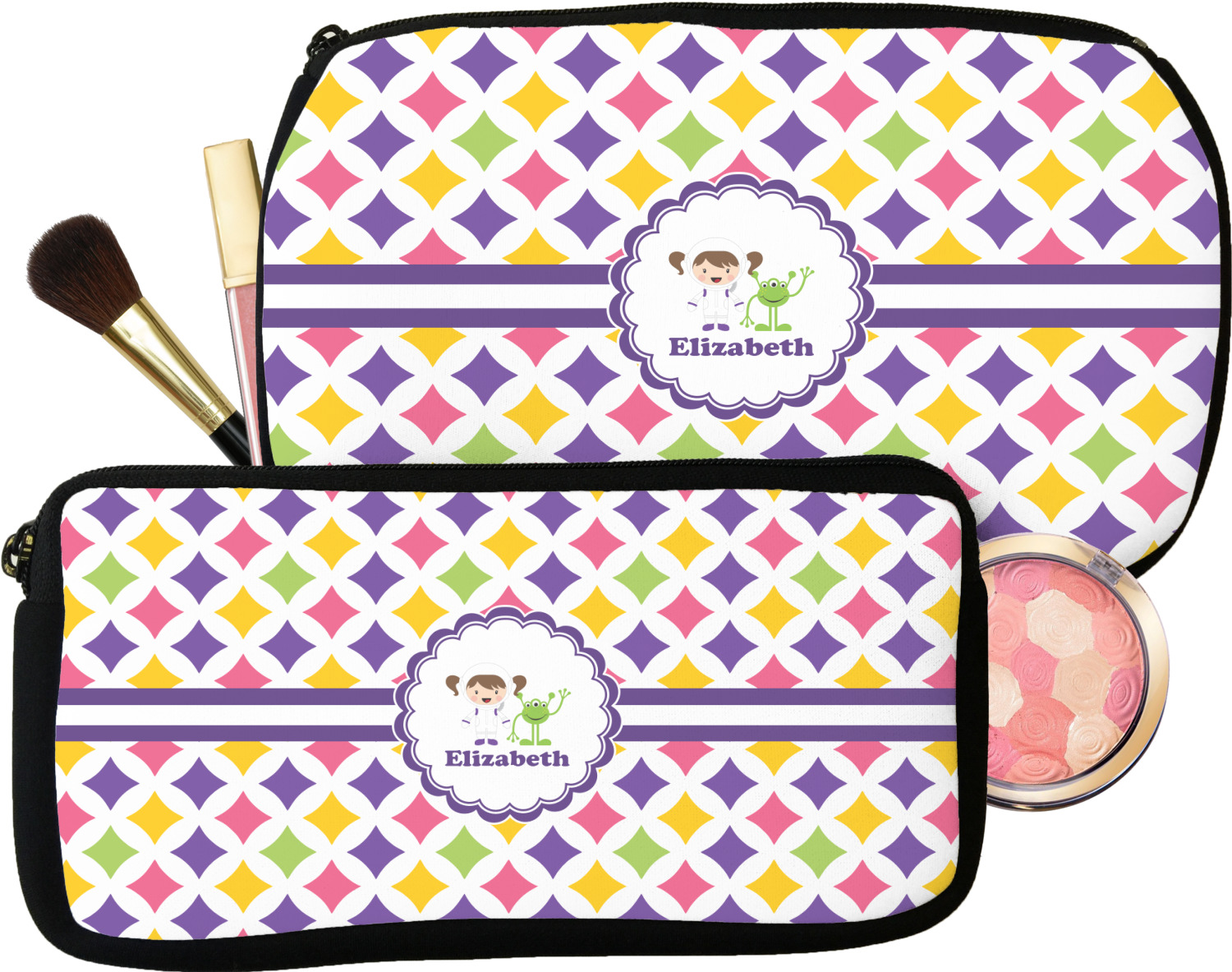 Our personalized makeup bags are available in many different designs, patterns and colors - so you are sure to find one that will love. They are made of neoprene (same material as wet-suits) and thus are water resistant, so spillages in your makeup bag will not end up all over you purse. They are customized on one side and are black on the other side and the zipper is black as well.