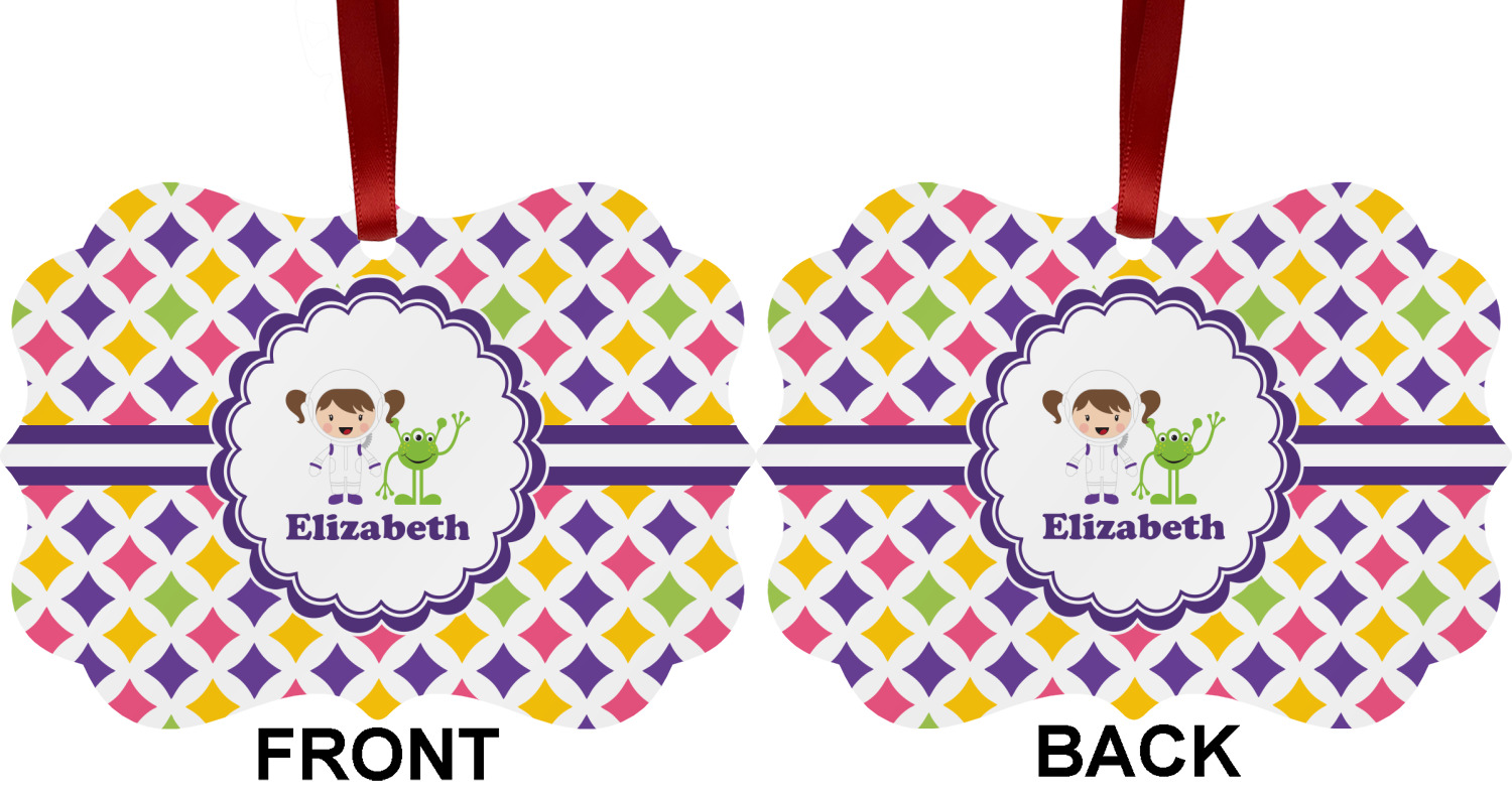 This pattern is very versatile and will mix and match with a variety of coordinated colors. A wide white band trimmed in purple tie it all together showing off little favorite personalized space girl and her favorite martian.