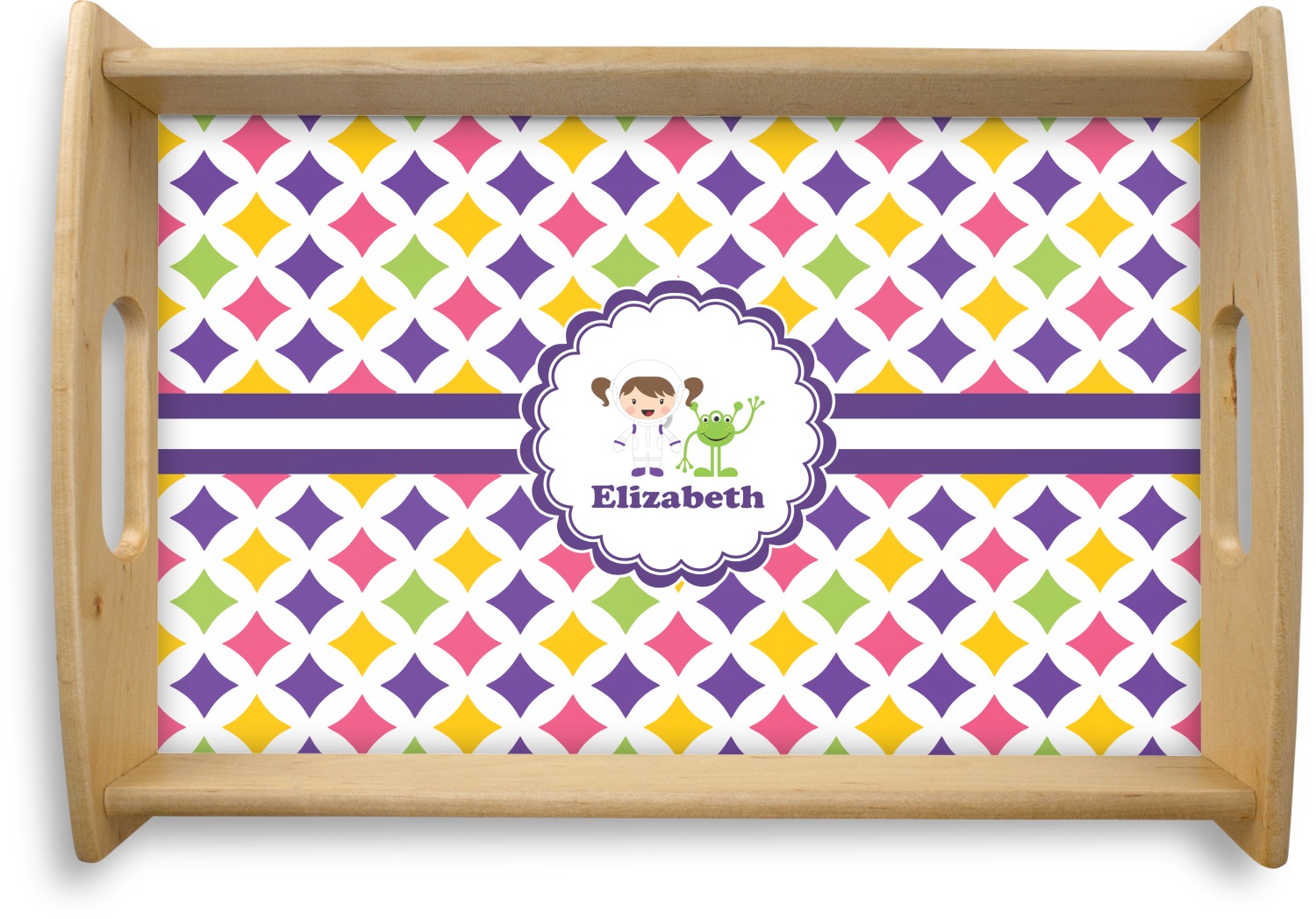 This serving tray with handles features square edges and two rounded sides, creating a very modern look. Each side is fabricated from a beautifully cut, natural wood. The bottom of the interior of the tray displays your customized design in bright, vibrant color. The tray is sold in both a black color and a natural wood look. Each variation of the wood serving tray has two sizes: Small, which is 14" x 10" x 2.25", and Large, which is 19.5" x 13.5" x 2.75".