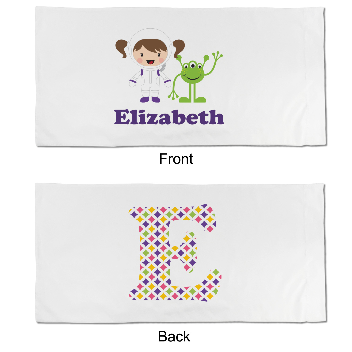 This pattern is very versatile and will mix and match with a variety of coordinated colors. A wide white band trimmed in purple tie it all together showing off little favorite personalized space girl and her favorite martian.