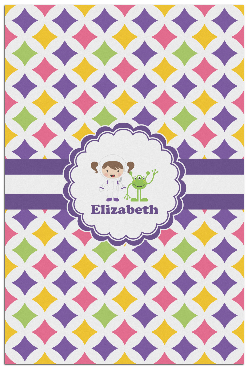 This pattern is very versatile and will mix and match with a variety of coordinated colors. A wide white band trimmed in purple tie it all together showing off little favorite personalized space girl and her favorite martian.