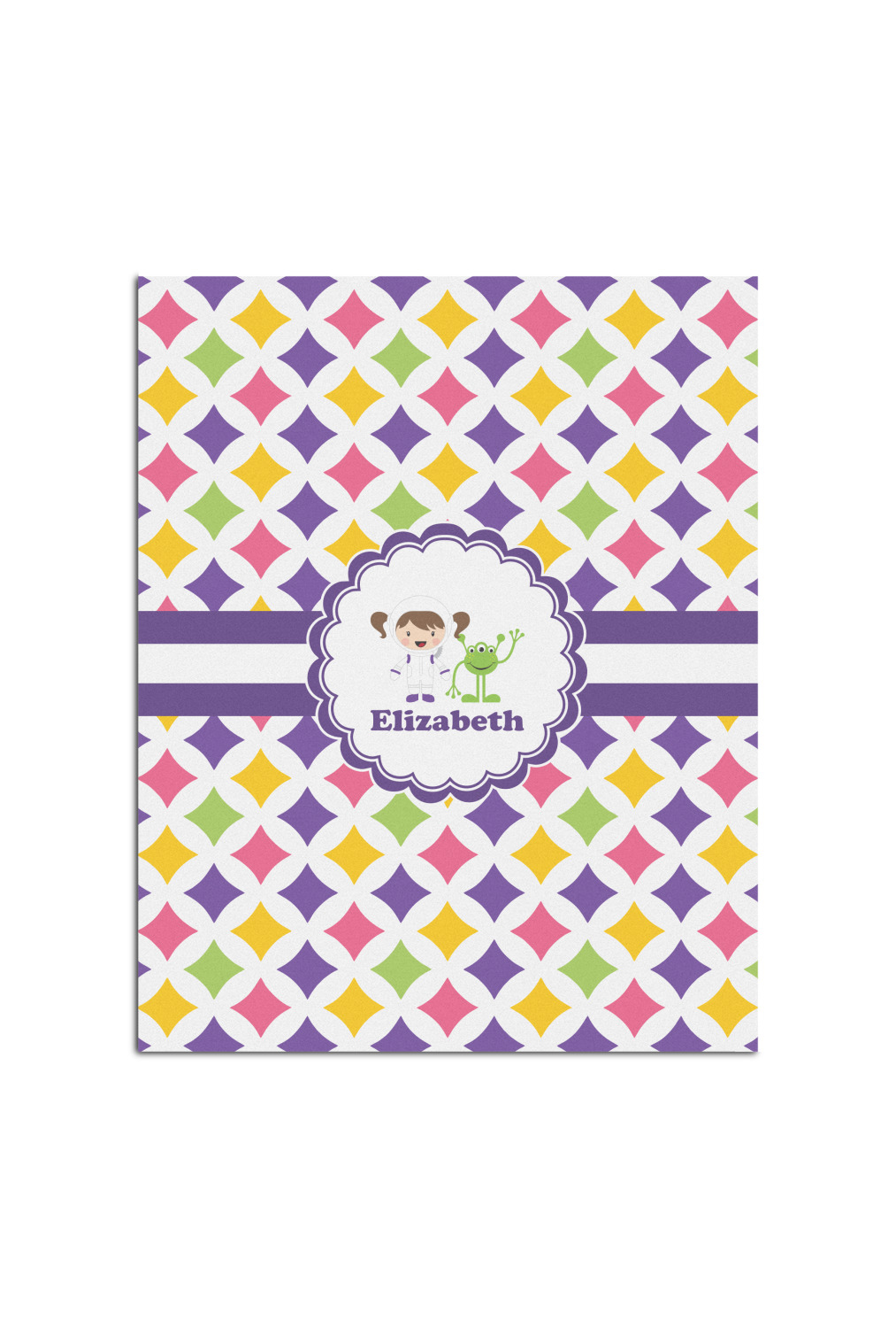 This pattern is very versatile and will mix and match with a variety of coordinated colors. A wide white band trimmed in purple tie it all together showing off little favorite personalized space girl and her favorite martian.