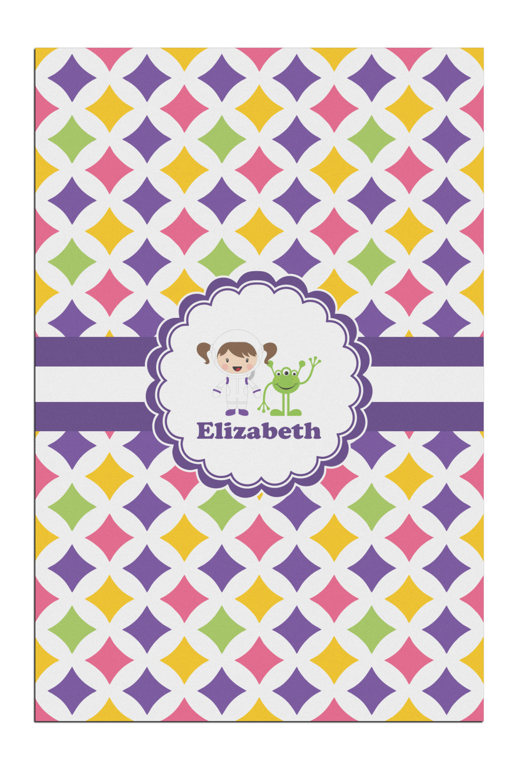 This pattern is very versatile and will mix and match with a variety of coordinated colors. A wide white band trimmed in purple tie it all together showing off little favorite personalized space girl and her favorite martian.