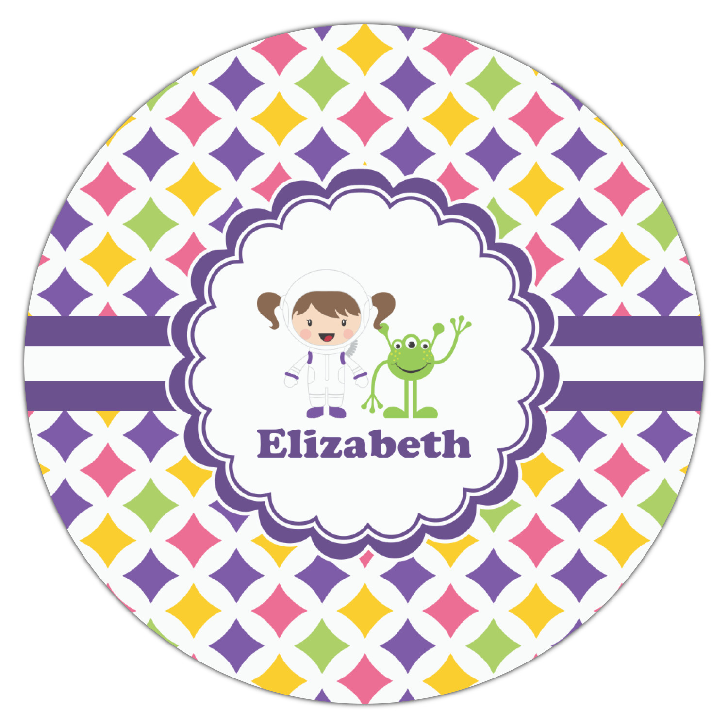 This pattern is very versatile and will mix and match with a variety of coordinated colors. A wide white band trimmed in purple tie it all together showing off little favorite personalized space girl and her favorite martian.