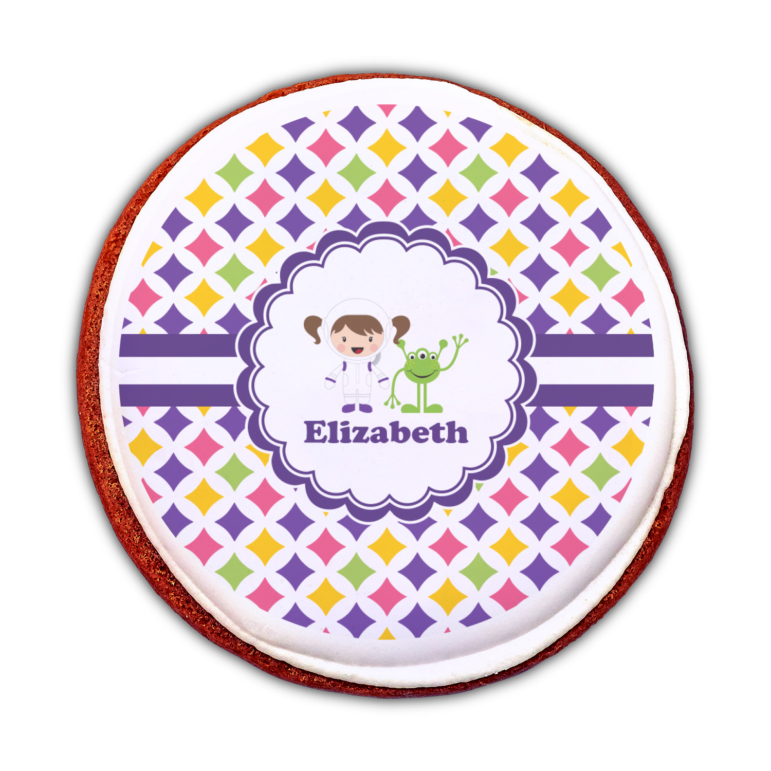 This pattern is very versatile and will mix and match with a variety of coordinated colors. A wide white band trimmed in purple tie it all together showing off little favorite personalized space girl and her favorite martian.