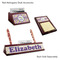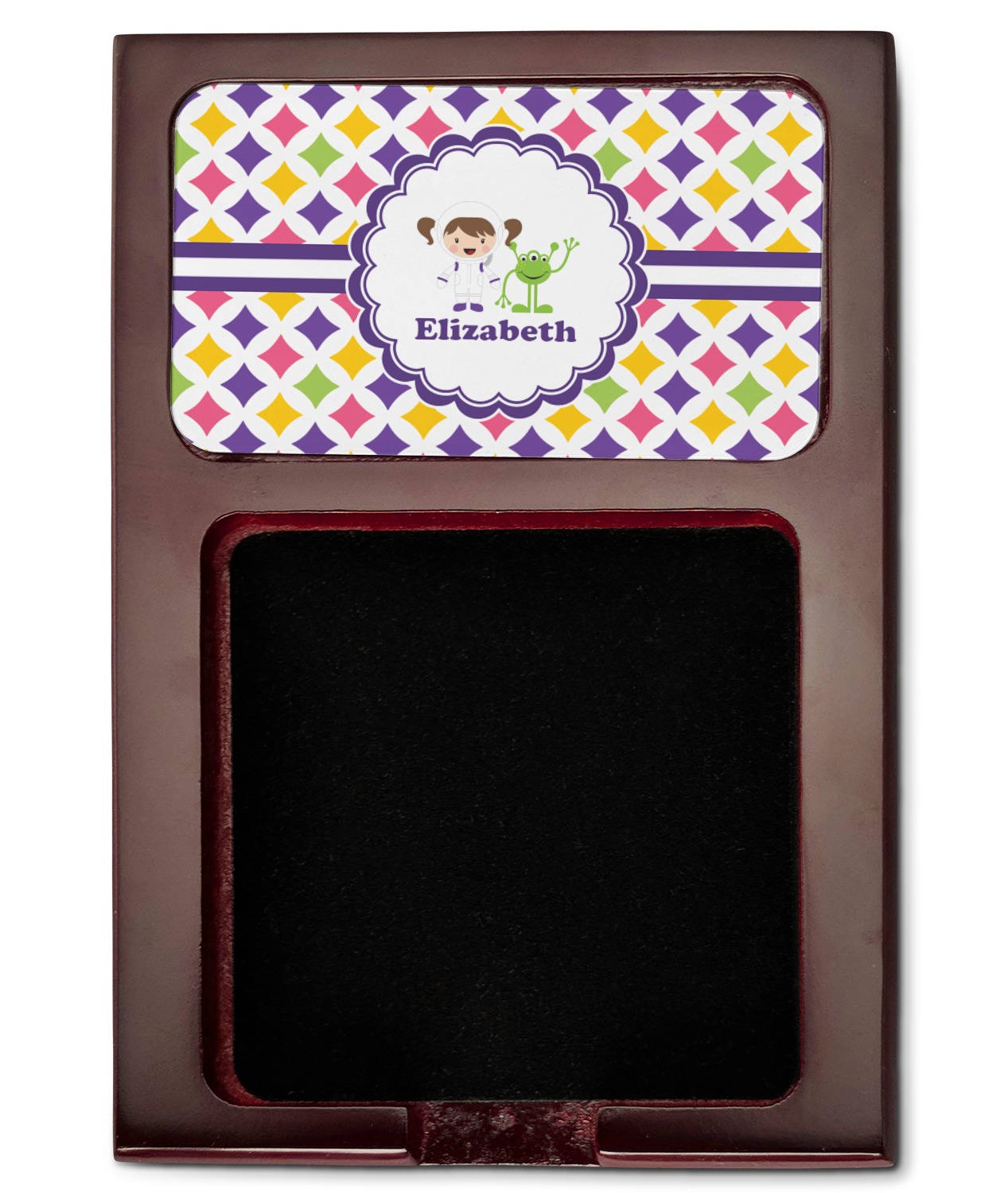 Crafted from a fine mahogany, this post it note holder is in the shade of a dark, cherry color. The dispenser itself is about 4.25 by 6.25 by 0.75 inches. You can place your 3 by 3 inch sticky notes in the indentation below the nameplate. We print your customization onto the nameplate that rests above the velvety indentation.
