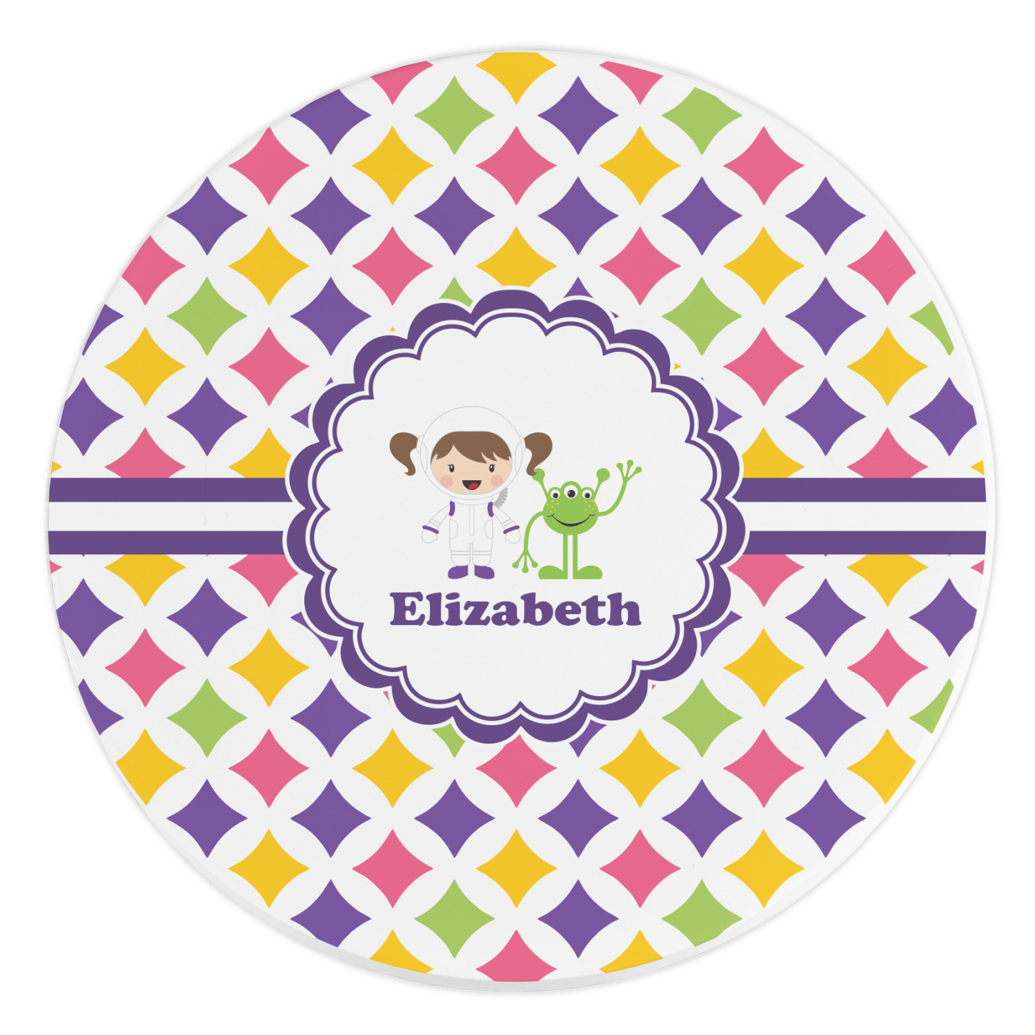 This pattern is very versatile and will mix and match with a variety of coordinated colors. A wide white band trimmed in purple tie it all together showing off little favorite personalized space girl and her favorite martian.