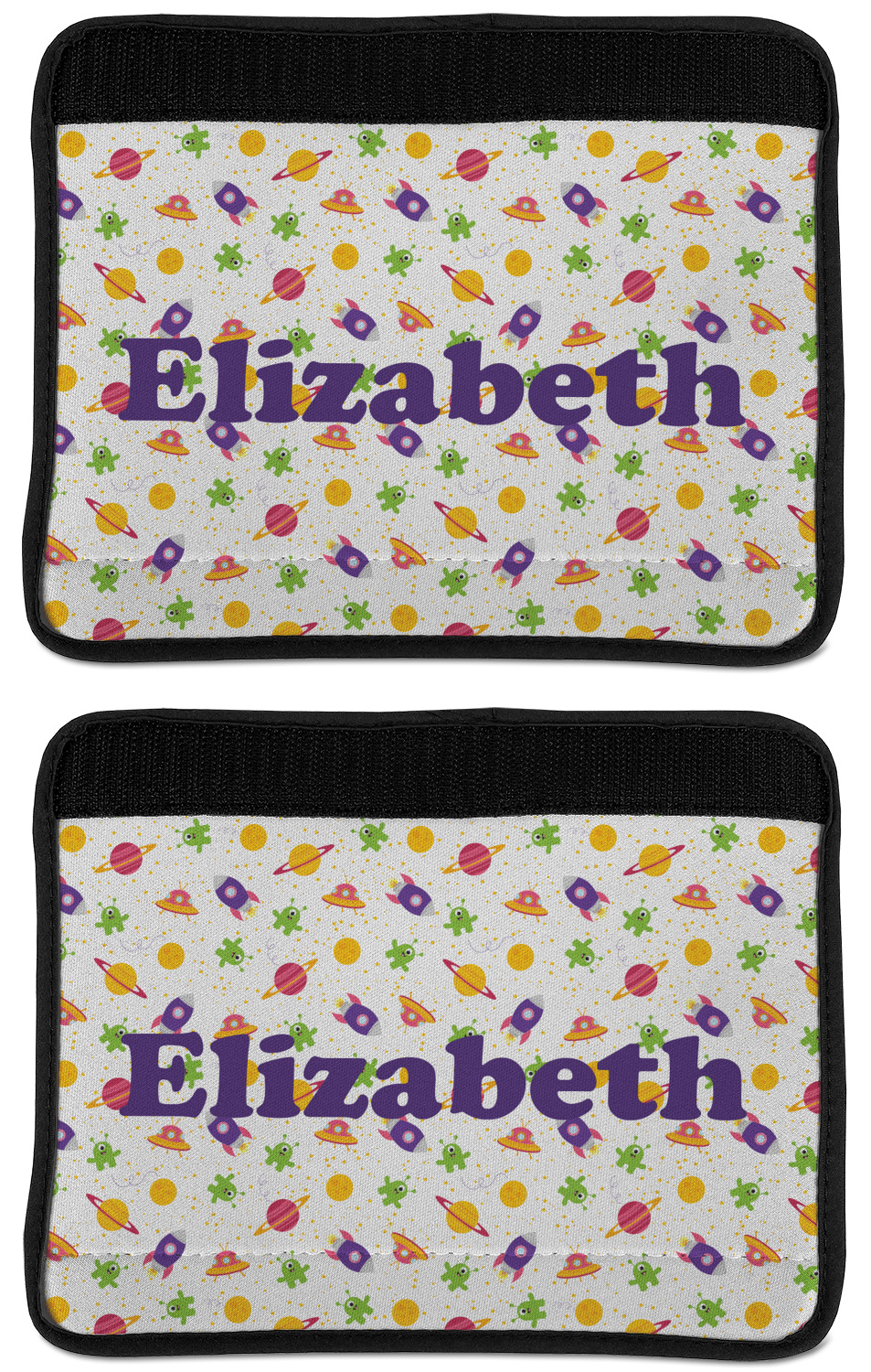 Made from neoprene, our seat belt strap covers wrap around the belt itself and have a Velcro tab for easy attachment and closure. The belt's edges are trimmed with a black polyester for a secure finish. Each cover is 9.5 by 7 inches when open and 9.5 by 2.5 inches when closed. We print your personalized design on the face of the seat belt pad.