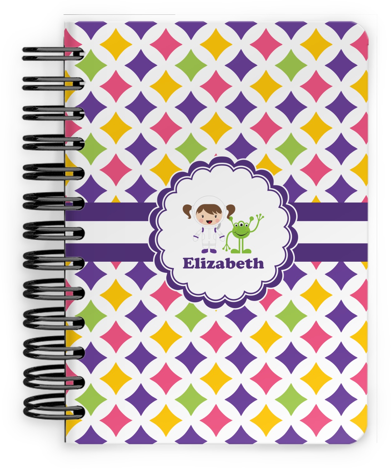 This spiral notebook includes 75 sheets of thick, ruled paper. The front and back of this custom notebook is made of a robust, laminate, plastic covering. We print your personalization on these two panels, underneath a glossy finish, which emphasizes the colors of your design. The two panels and the sheets of paper are held together by a sturdy, black coil. The paper within your bound notebook is perforated for easy, clean tearing.