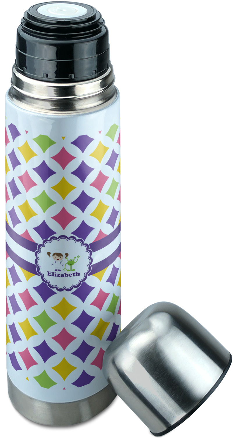 Manufactured from stainless steel, this thermos is built durably and double-walled insulated to preserve the temperature of your drink for hours. It also features a screw off lid that is made to also function as a small cup. Upon unscrewing this part of the thermos bottle, a pop-open, pour feature emerges. This feature allows you to slowly pour your beverage into your lid, ensuring a steady, controlled pour into your lid or other cup. With a capacity of 25 ounces, these large thermoses can hold several servings of your favorite beverage. Your customization is displayed all around the bottle with bright, vibrant color.