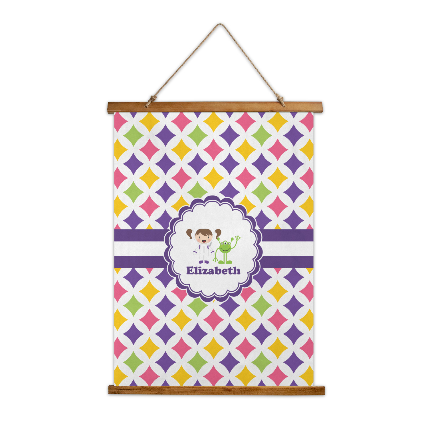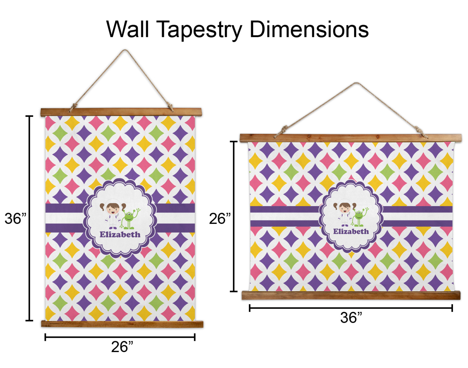 Made in two different orientations - portrait or landscape - both are 26" x 36". Your design is printed on a high quality polyester fabric with hemmed edges. The wood on the top and bottom of the tapestry is 1.25" tall and 0.25" thick and there are two pieces on top and bottom which sandwich the fabric.
