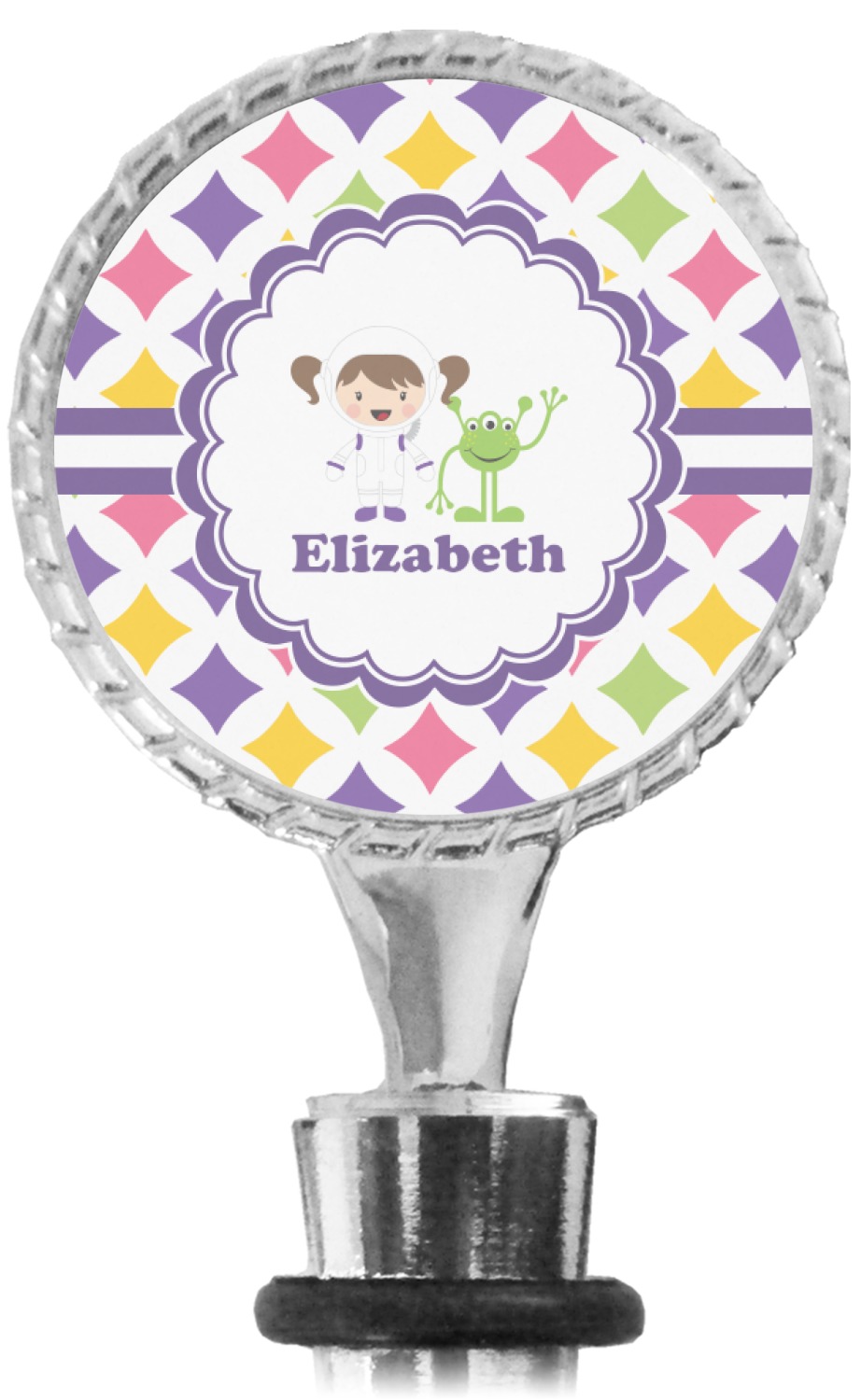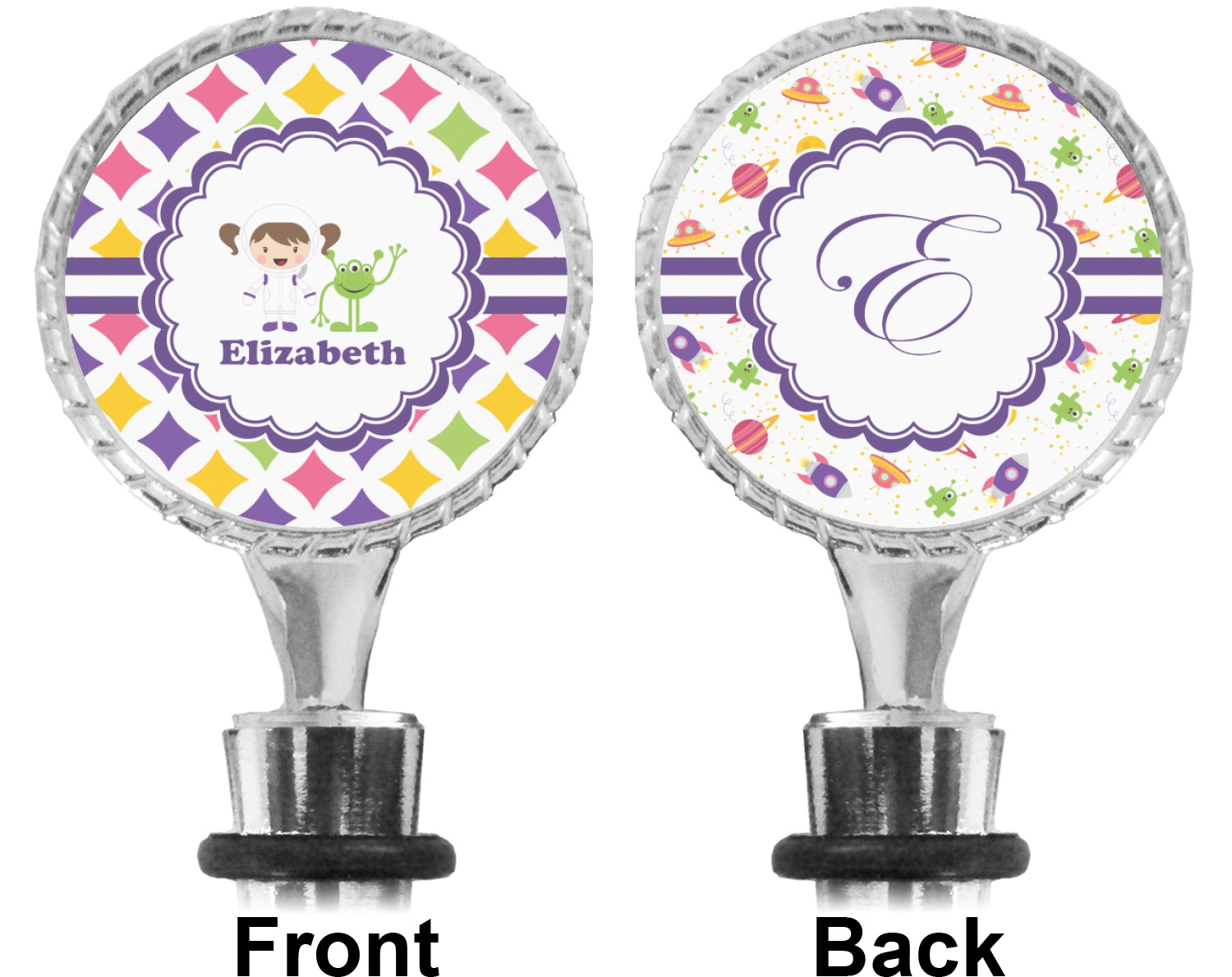 The top part of your bottle stopper is comprised of a zinc ring that displays your customization(s) in its middle, on both sides. The ring is heavy duty, with a bright chrome finish. The body of the wine stoppers have two silicone rings to provide an airtight seal. These wine bottle stoppers measure at 1.625" L x 0.8125" W x 4.625" H; your custom wine stopper is meant to fit into most standard-sized wine bottles.