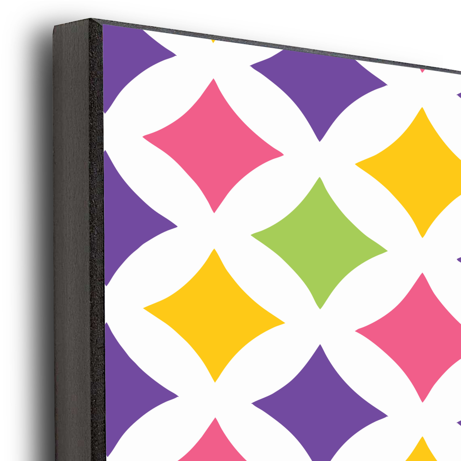 This is a blast from the past pattern reminiscent of the how we envisioned the future. This retro diamond pattern is covered with purple, pink, yellow, and green diamonds on a white background.