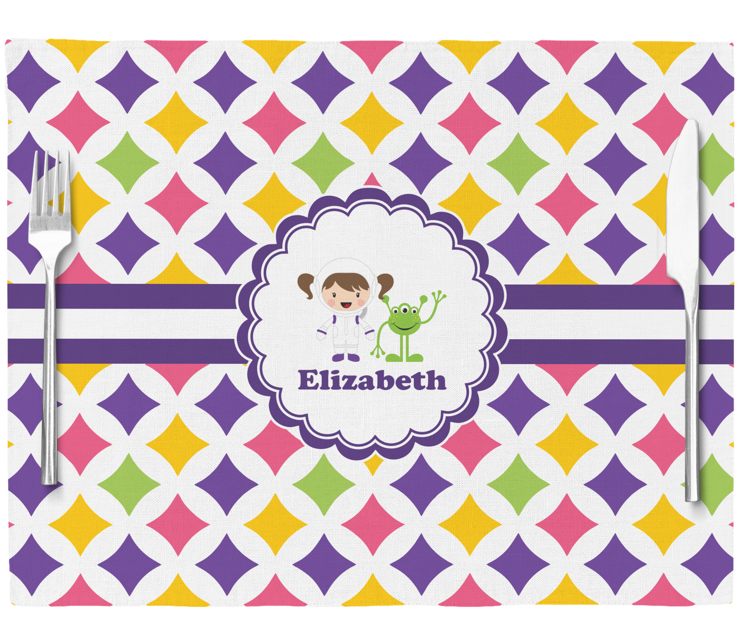 This pattern is very versatile and will mix and match with a variety of coordinated colors. A wide white band trimmed in purple tie it all together showing off little favorite personalized space girl and her favorite martian.