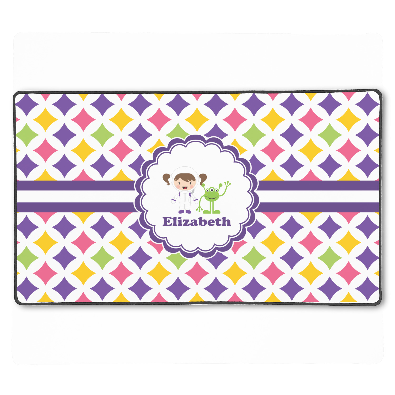 This pattern is very versatile and will mix and match with a variety of coordinated colors. A wide white band trimmed in purple tie it all together showing off little favorite personalized space girl and her favorite martian.