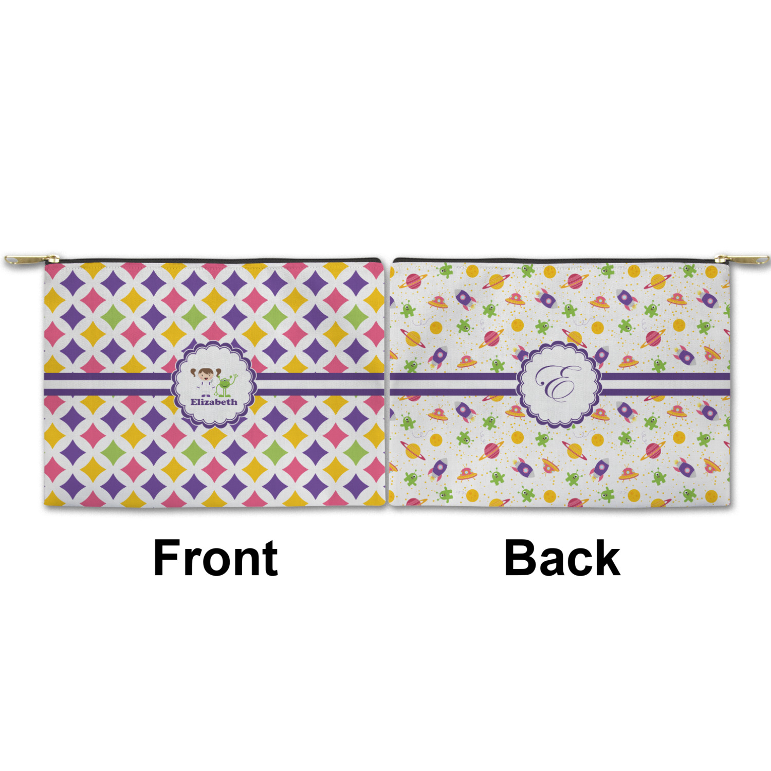 You can design both the front and the back of the pouch - same design, two complementary designs or two totally different designs - the choice is yours! We offer many different personalization styles i.e. name, name & initial, monograms - so the choice to personalize is also yours.
