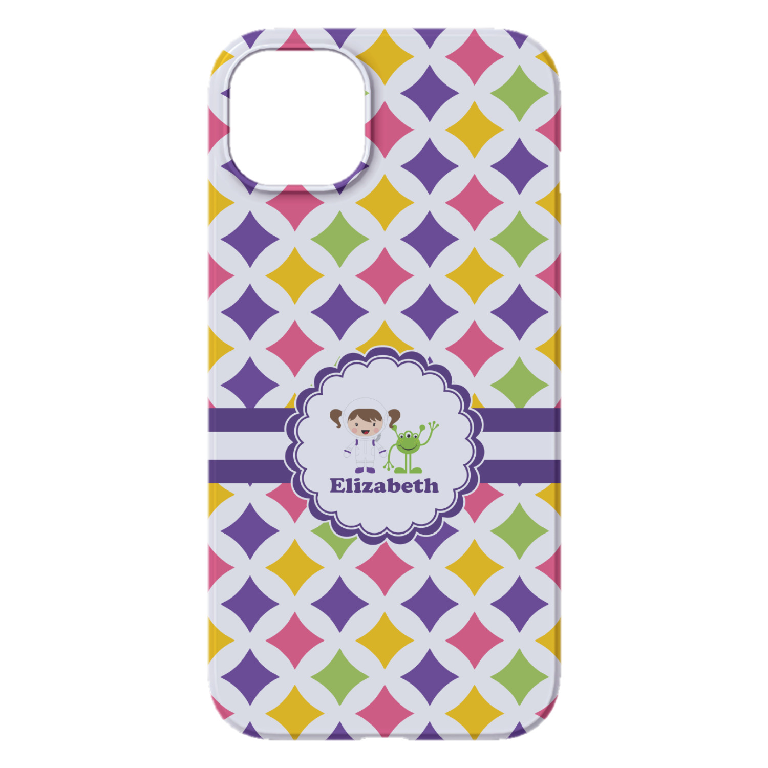 This is a blast from the past pattern reminiscent of the how we envisioned the future. This retro diamond pattern is covered with purple, pink, yellow, and green diamonds on a white background.