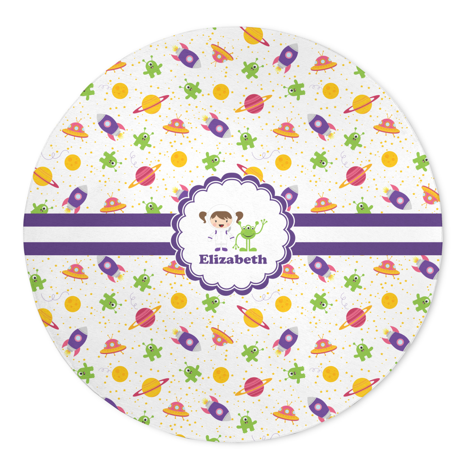 Explore another galaxy with this whimsical space design. Fun colors of yellow, pink, purple, and green make this design of space exploration come alive. The design is full of little green martians, purple and pink spaceships, yellow and pink planets, and yellow stars galore.
