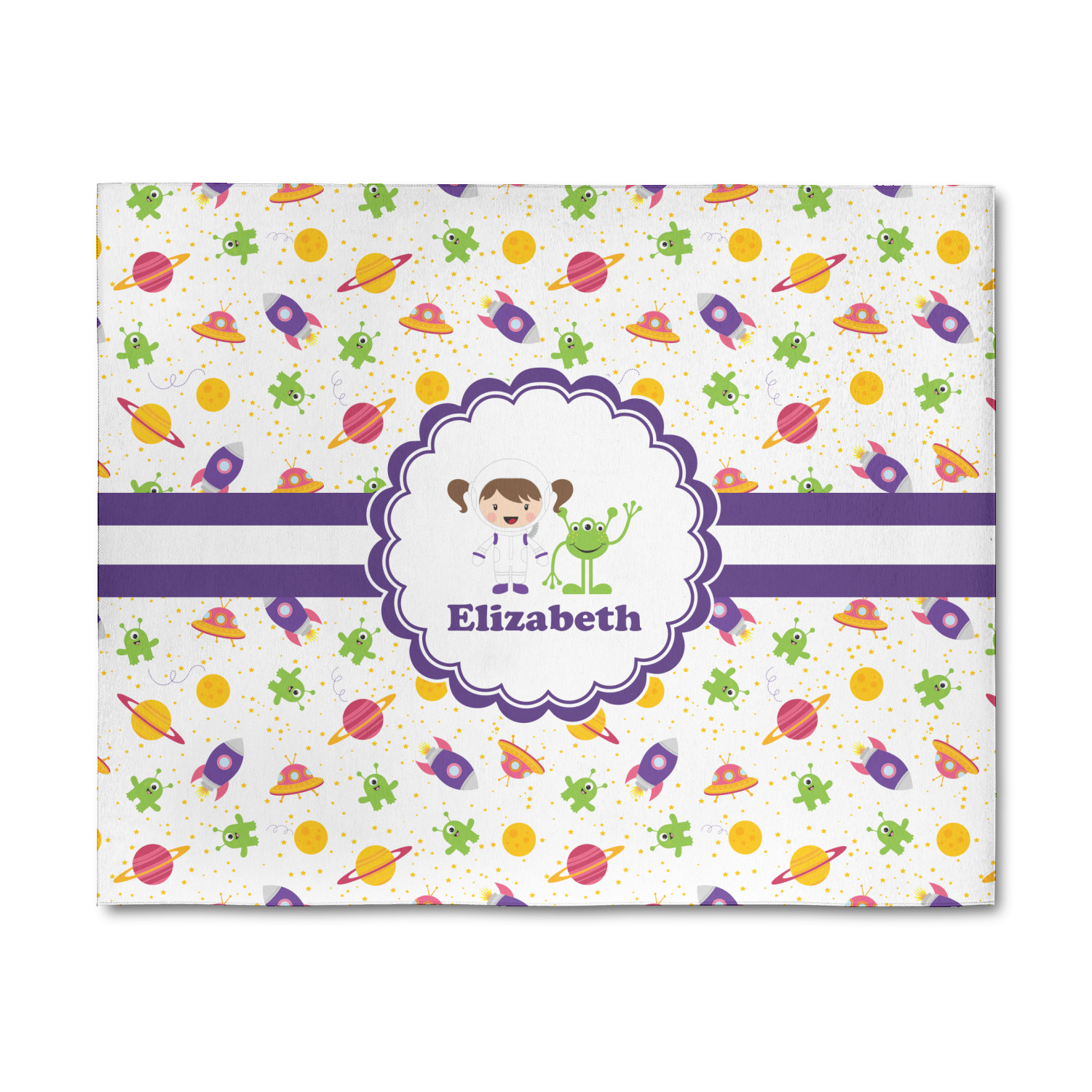 Explore another galaxy with this whimsical space design. Fun colors of yellow, pink, purple, and green make this design of space exploration come alive. The design is full of little green martians, purple and pink spaceships, yellow and pink planets, and yellow stars galore.