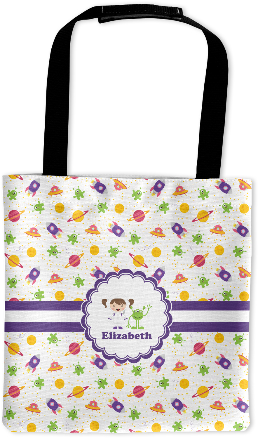Explore another galaxy with this whimsical space design. Fun colors of yellow, pink, purple, and green make this design of space exploration come alive. The design is full of little green martians, purple and pink spaceships, yellow and pink planets, and yellow stars galore.