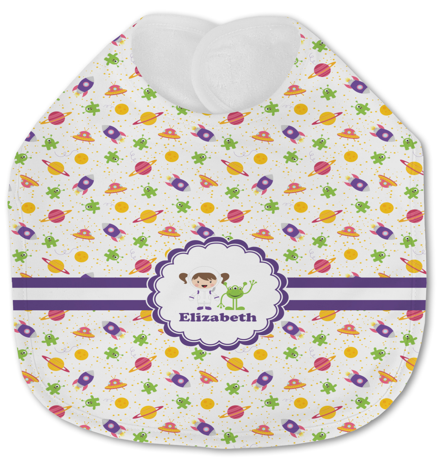 Made of soft polyester, each customizable bib hugs comfortably around the neck to catch every drip and drool. Each bib design is printed with baby-safe ink and finished with a secure stitch pattern and velcro clasp. We carry two customizable bib styles -Microfiber Velour and Jersey Knit.