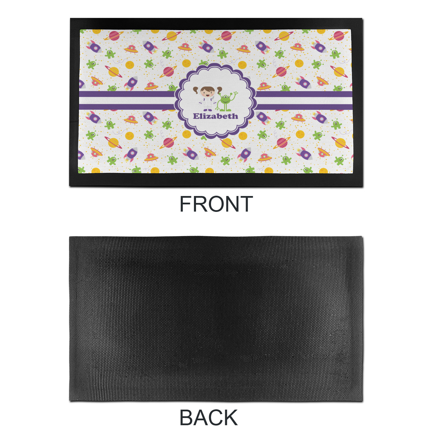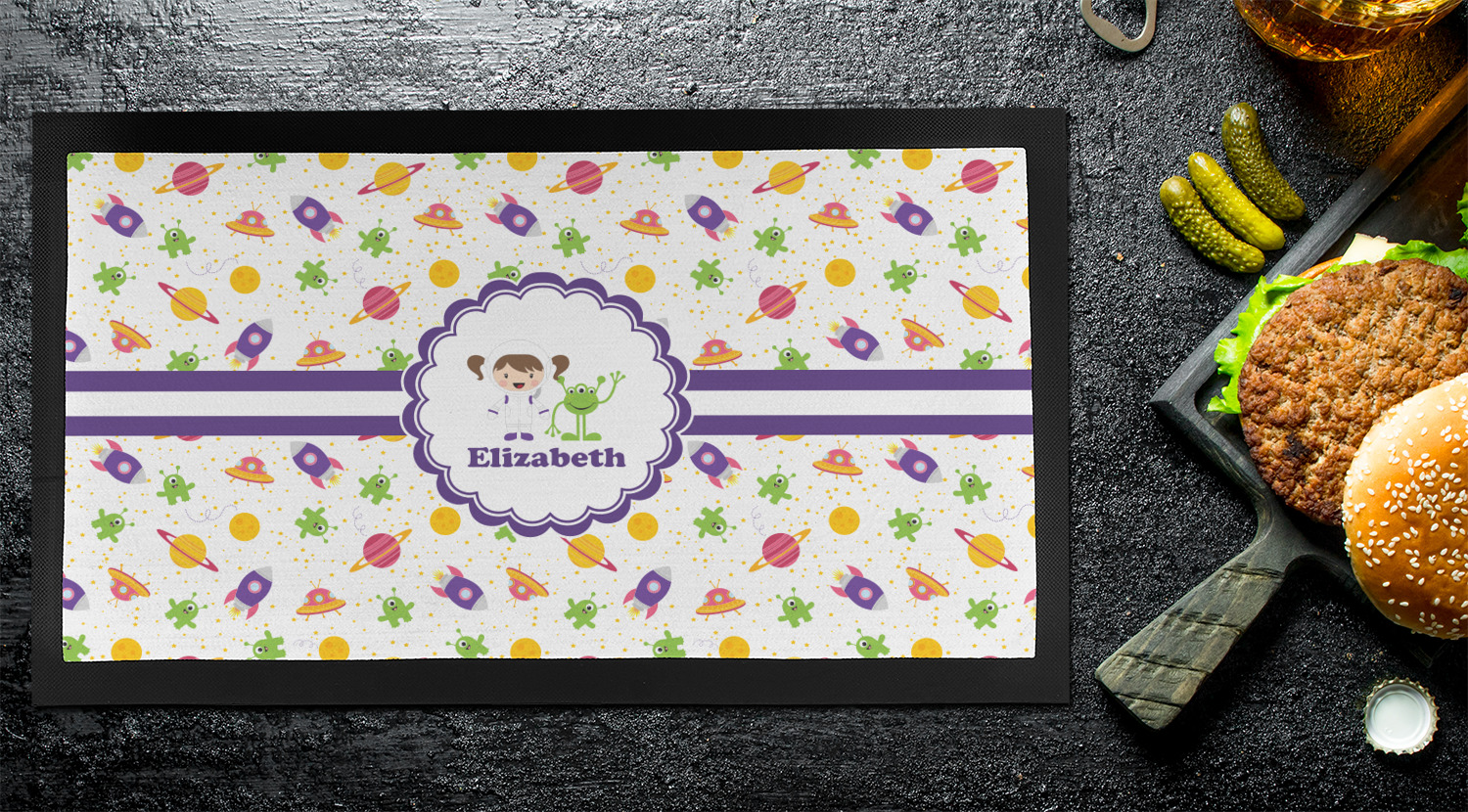 Explore another galaxy with this whimsical space design. Fun colors of yellow, pink, purple, and green make this design of space exploration come alive. The design is full of little green martians, purple and pink spaceships, yellow and pink planets, and yellow stars galore.