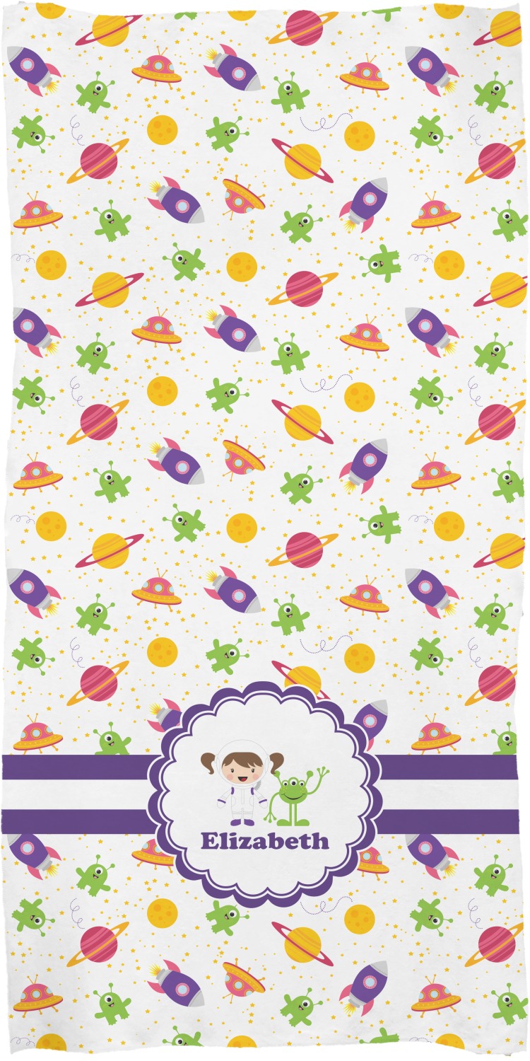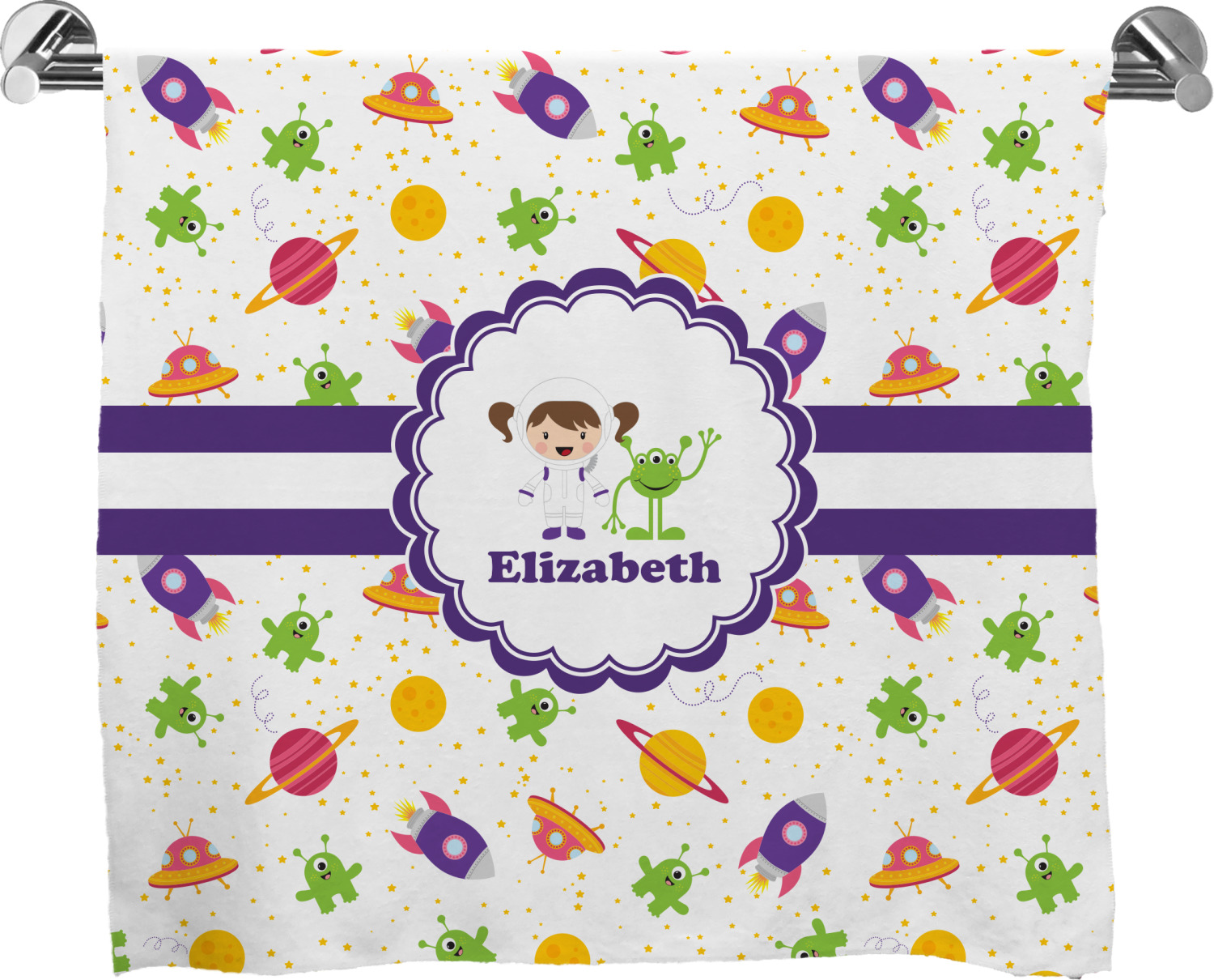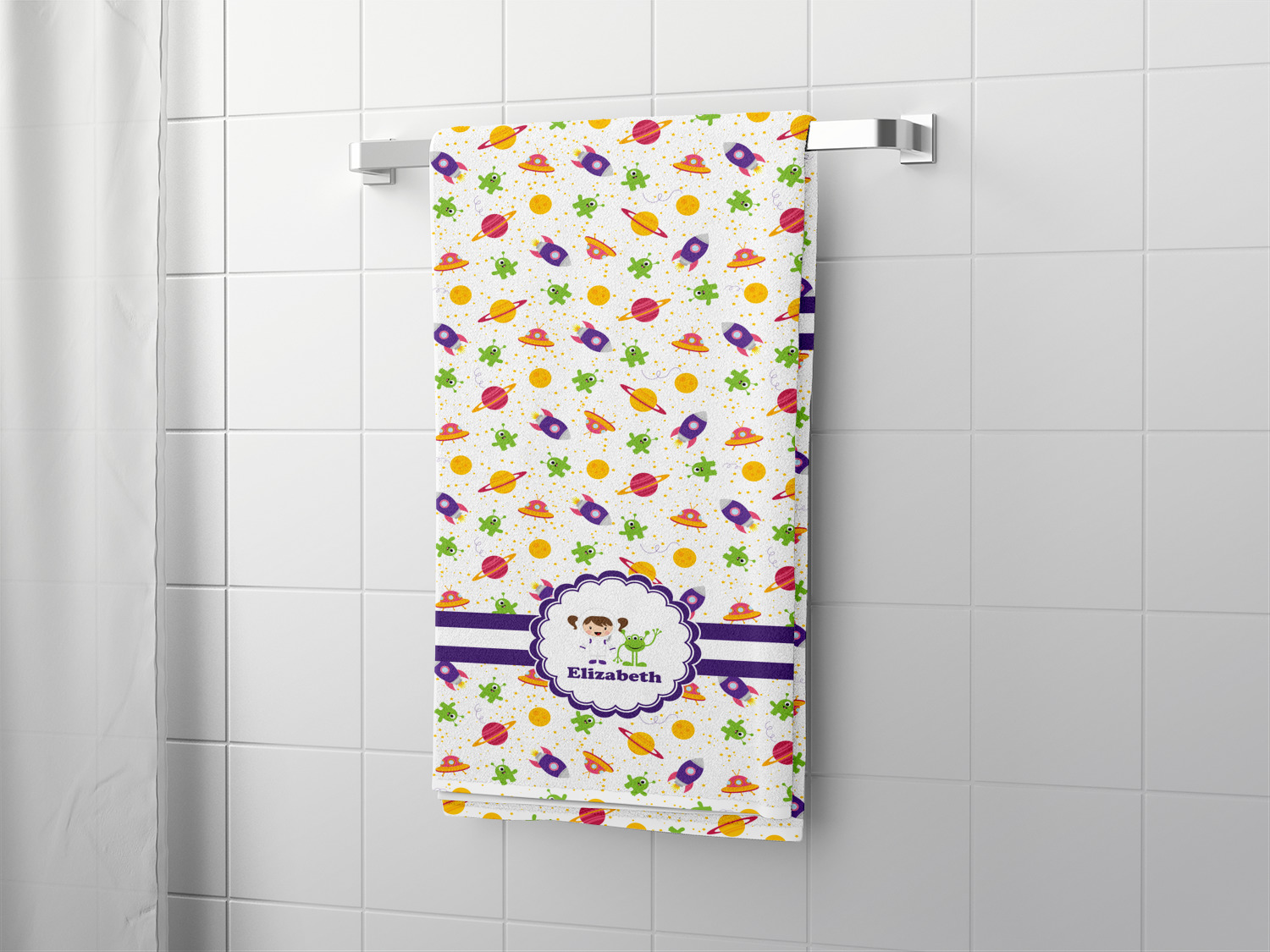 These customized bath towels are slightly larger than your standard towel and are the ideal size for wrapping around your body. They measure approximately 60" x 30". Your customization is displayed across the entire front face of the towel, while the back is white.