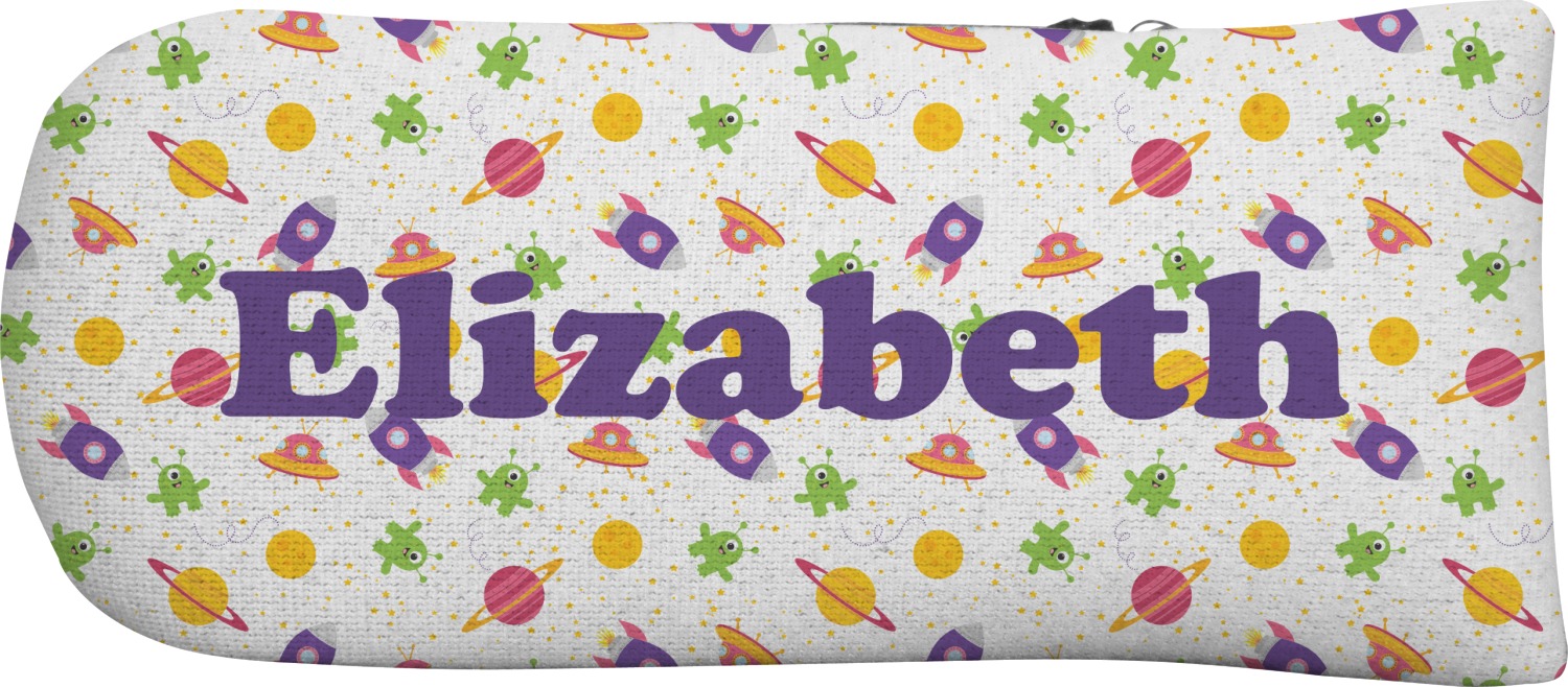 Explore another galaxy with this whimsical space design. Fun colors of yellow, pink, purple, and green make this design of space exploration come alive. The design is full of little green martians, purple and pink spaceships, yellow and pink planets, and yellow stars galore.
