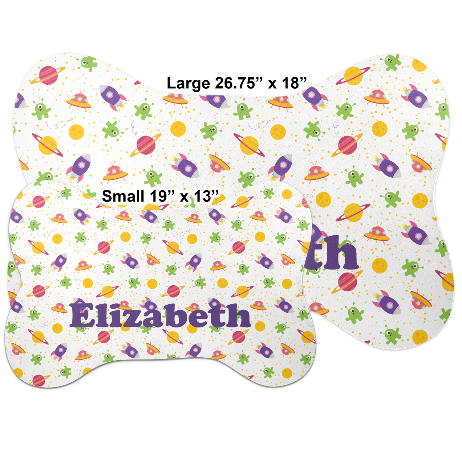 The top of this mat displays your custom design, as it is printed on polyester. To prevent slippage, the underside of the mat is made of rubber. We offer a small dog food mat, suitable for smaller dogs and a large dog food mat for bigger breeds. The small dog food mat is approximately 19 by 13 inches, while the large dog feeding mat measures at approximately 26.75 by 18 inches. Both personalized mats are ideally sized to fit two dog bowls.