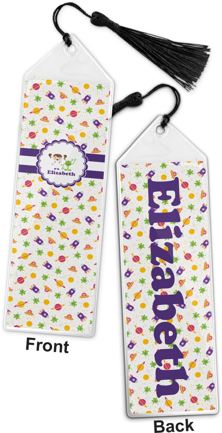 Your personalized bookmark is made of a sturdy, clear vinyl, and is approximately 7.5" x 2.25". We display your personalization on vinyl inserts that are placed on both sides. Accompanying each book marker is a black, fringe tassel that attaches to the reinforced, triangular header.