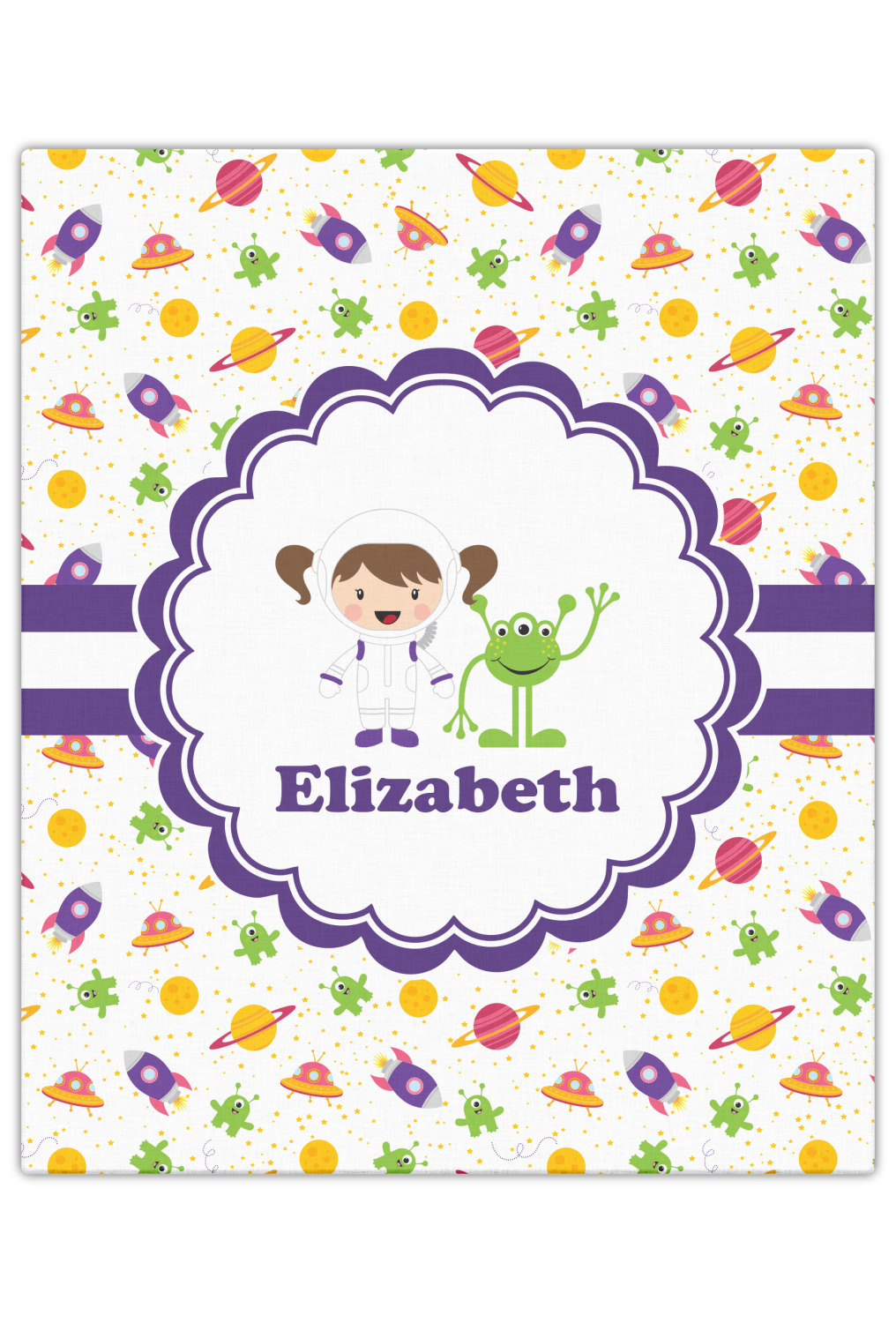 Explore another galaxy with this whimsical space design. Fun colors of yellow, pink, purple, and green make this design of space exploration come alive. The design is full of little green martians, purple and pink spaceships, yellow and pink planets, and yellow stars galore.