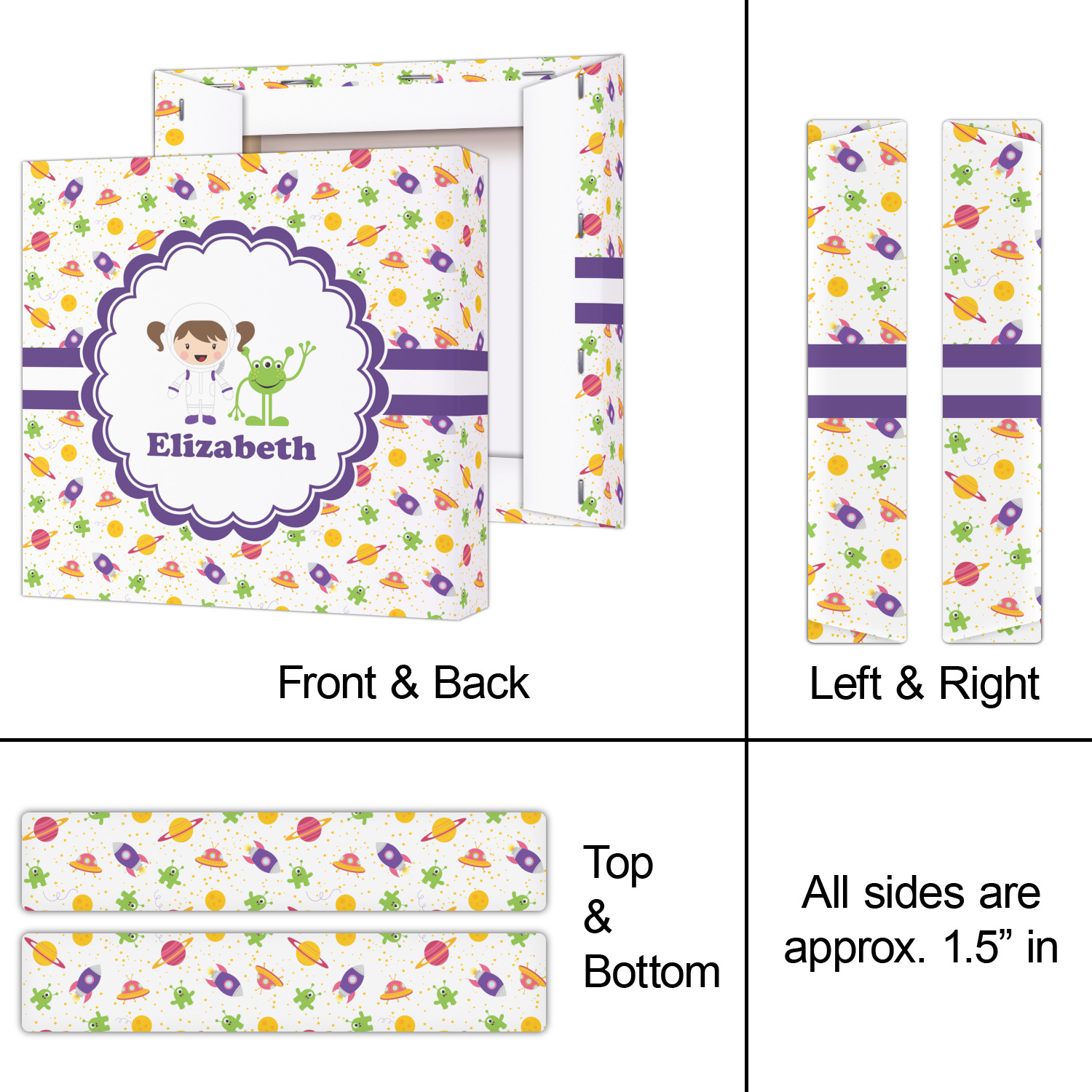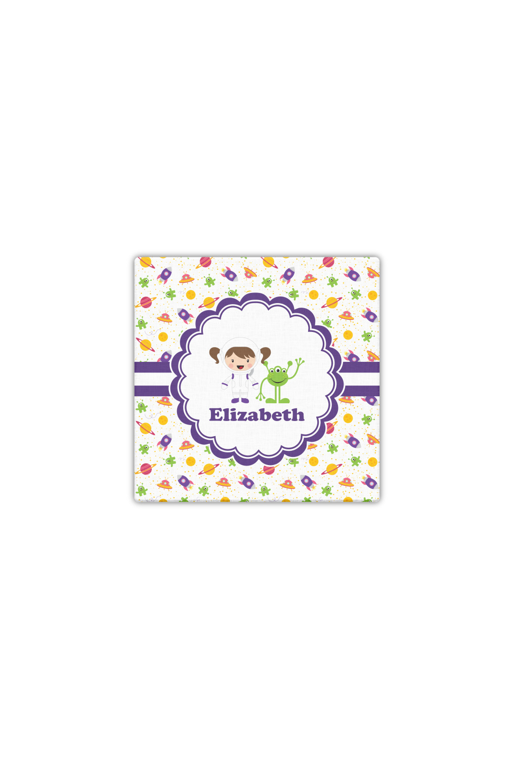 Explore another galaxy with this whimsical space design. Fun colors of yellow, pink, purple, and green make this design of space exploration come alive. The design is full of little green martians, purple and pink spaceships, yellow and pink planets, and yellow stars galore.